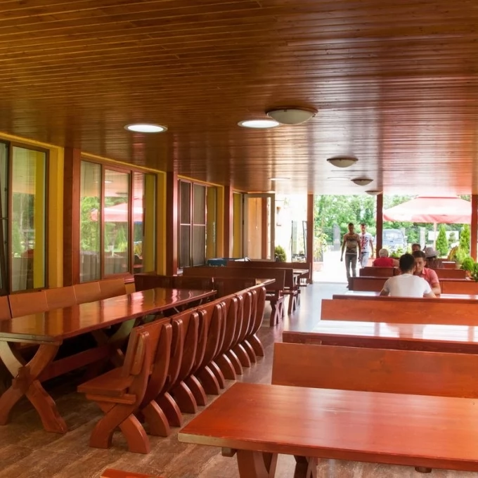 - A panzió saját étteremmel rendelkezik, amely 60 férőhelyes, és hagyományos román, valamint nemzetközi ételeket kínál "à la carte" menü alapján.