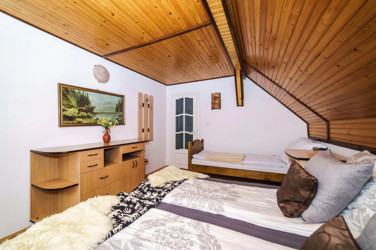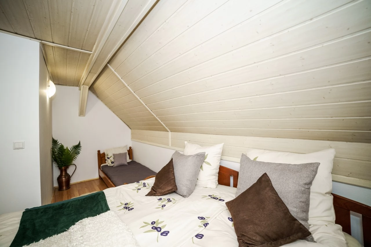 - Három hálószobában és a nappaliban összesen 10 személy számára biztosít szállást. Minden hálószobában 1 franciaágy és pótágy (2 szobában kisebb méretű pótágy gyereknek, 1 szobában normál méretű ágy 1 felnőttnek). A nappaliban további 2 férőhely van, kihúzható kanapén, a nappali mellett található az egyik fürdőszoba.
