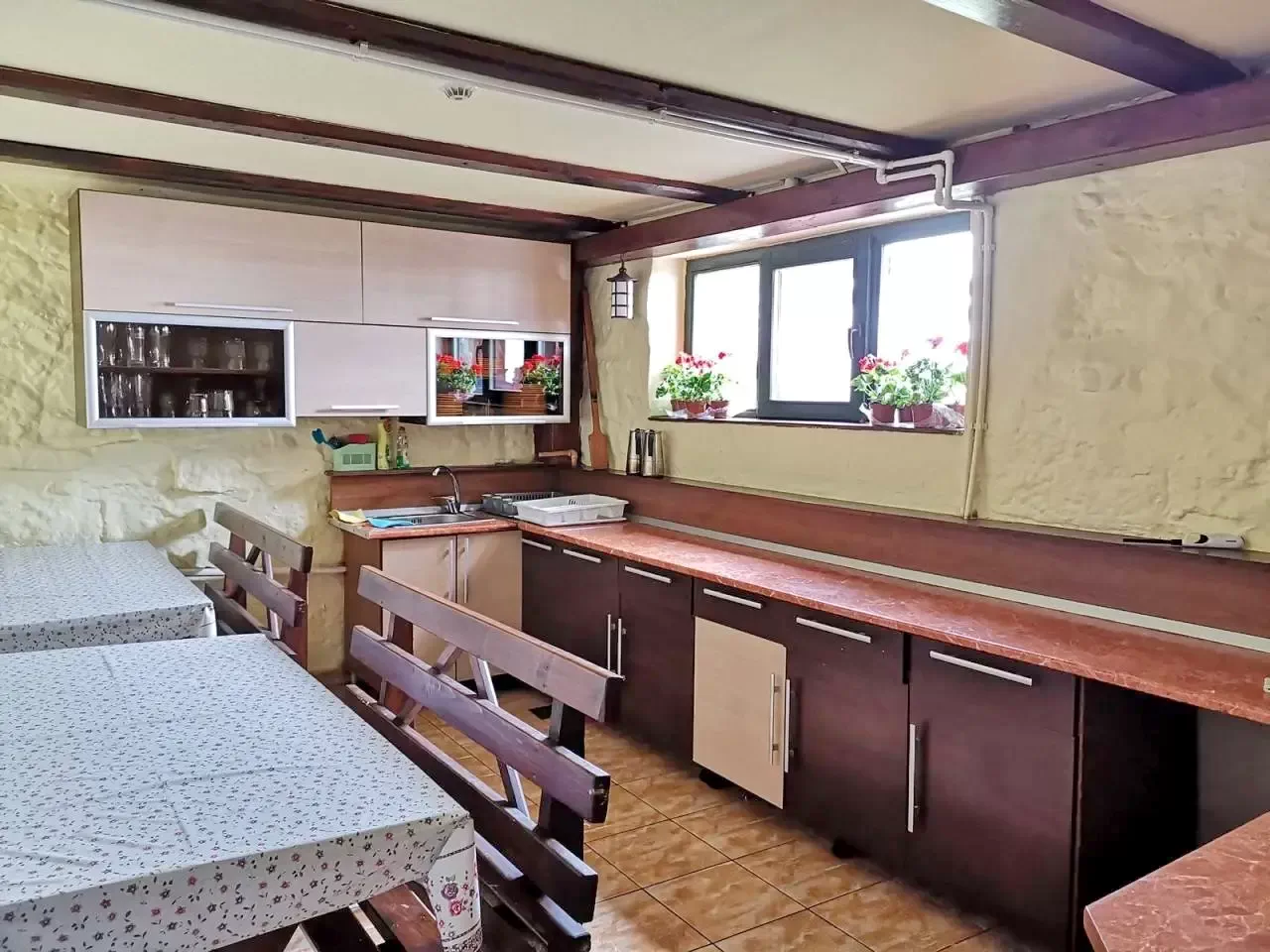 - A vendégek számára egy felszerelt konyha és egy közös ebédlő áll rendelkezésre, ahol saját maguk készíthetik el ételeiket.