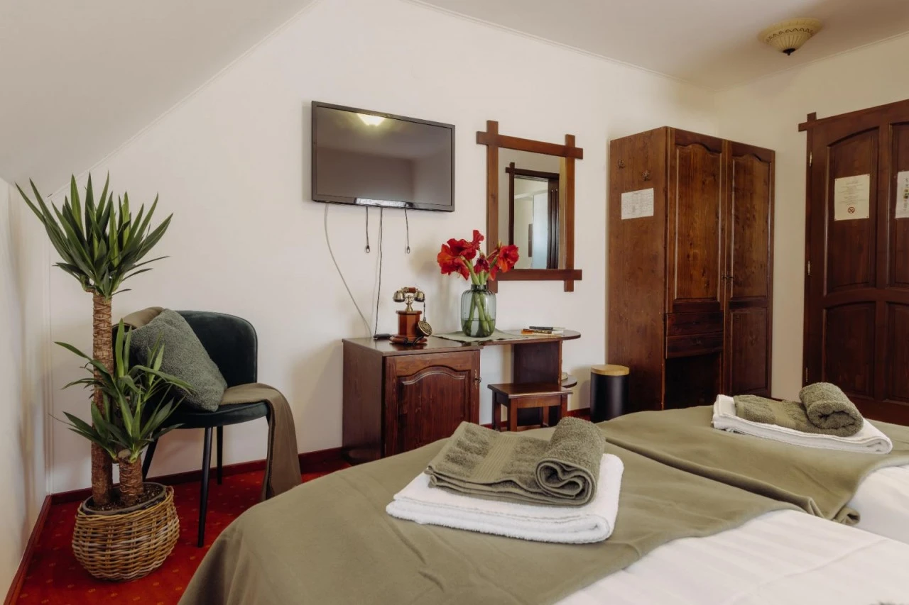 - szoba: 2 db egyszemélyes ágy, saját fürdő
