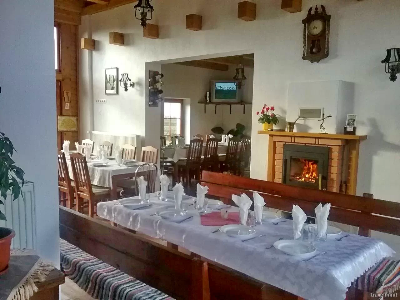 - Nagy nappali – vendéglő 22 férőhellyel, benne kandalló, nagy TV, Wc, illetve kézmosó helyiséggel. A panzió szálló- vendégeinek kiszolgálása, ellátása (félpanzió) itt történik.