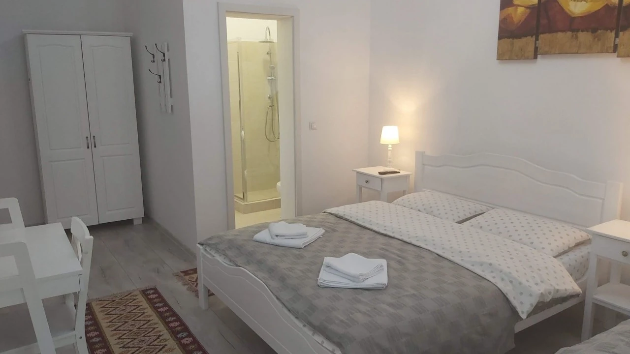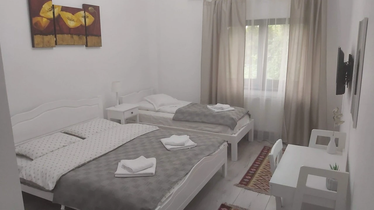 - 1 háromszemélyes szoba: 22 m²-es, erkéllyel, kertre néző kilátással, egy franciaágy és egy egyszemélyes ágy kombinációjával.