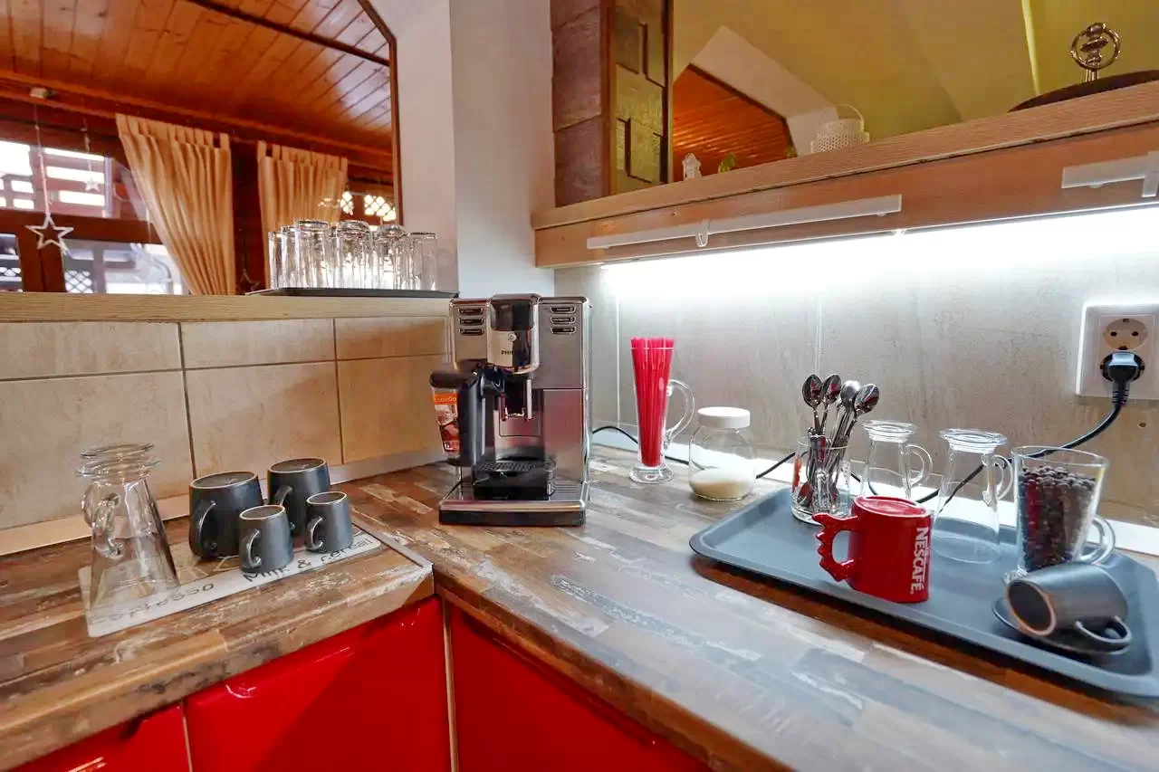 - Teljesen felszerelt konyha (indukciós sütő és főzőlap, mikrohullámú sütő, kenyérsütő, szendvicssütő, kávéfőző gép, hűtőszekrény).