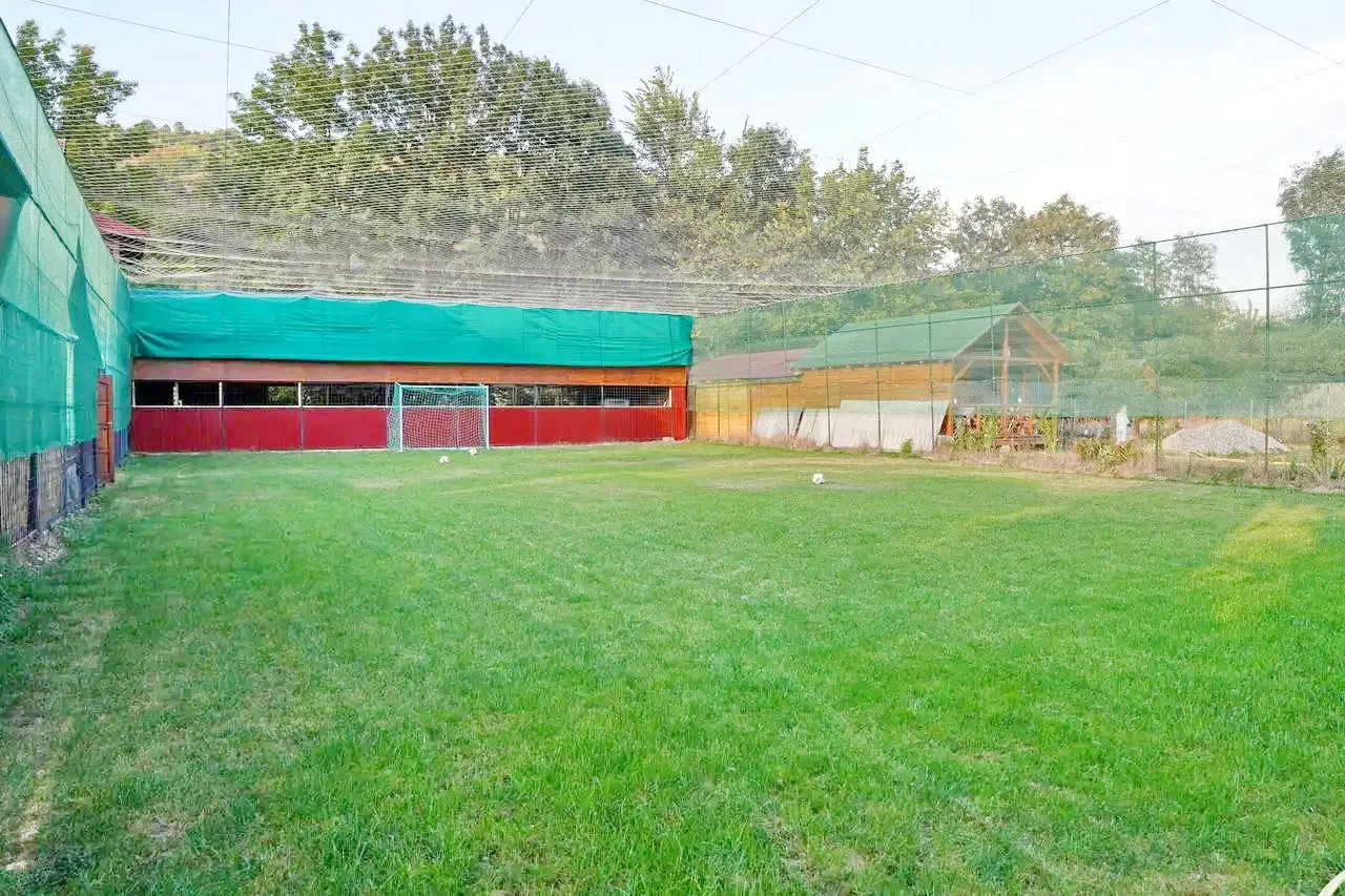- Füves focipálya és napozóágyak az udvaron és a medence mellett.