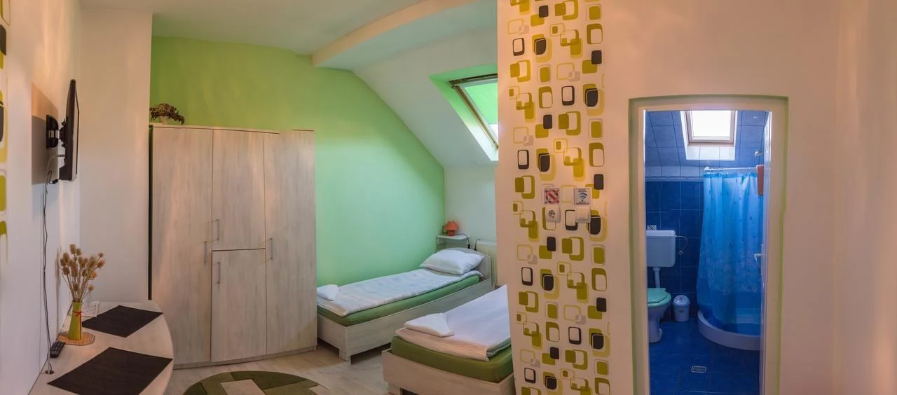- 2 háromszemélyes szoba (szobánként egy duplaágy és 1 egyszemélyes ágy)