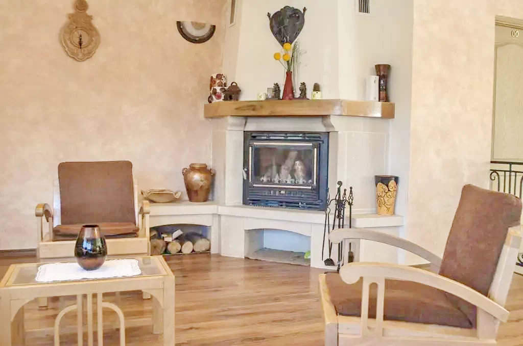 - A panzió modern közös konyhával és tágas, kandallóval ellátott nappalival, valamint étkezővel is rendelkezik.