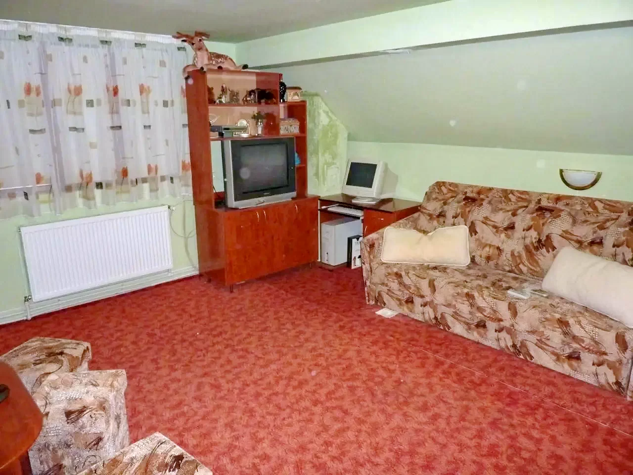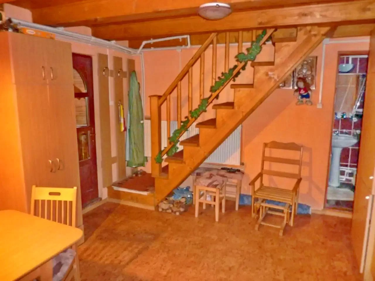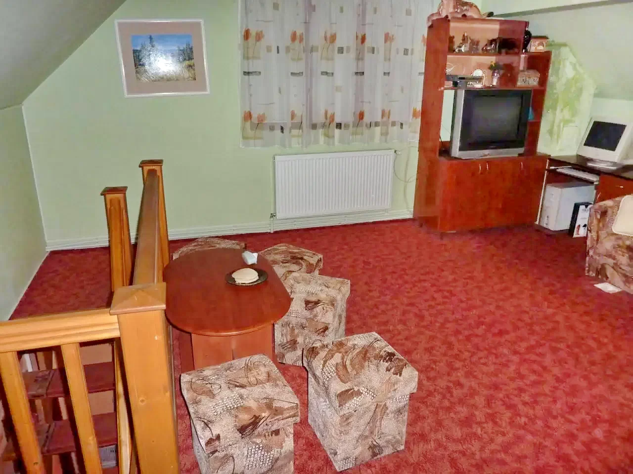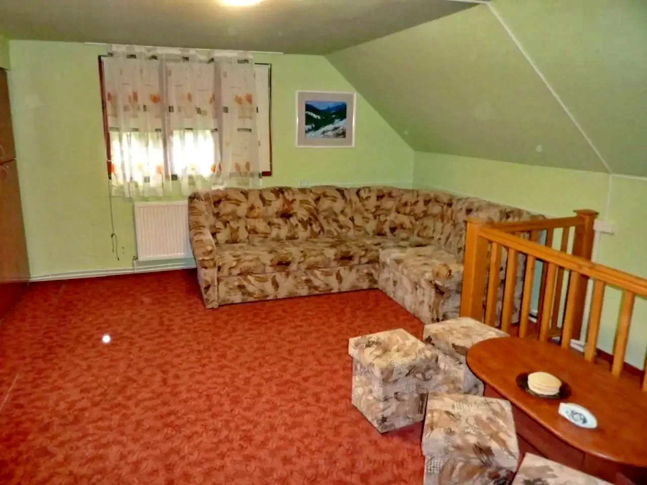 Az emeleten található egy szoba, melyben két db. kihúzható, kétszemélyes ágy található. (Összesen 4 fő!)