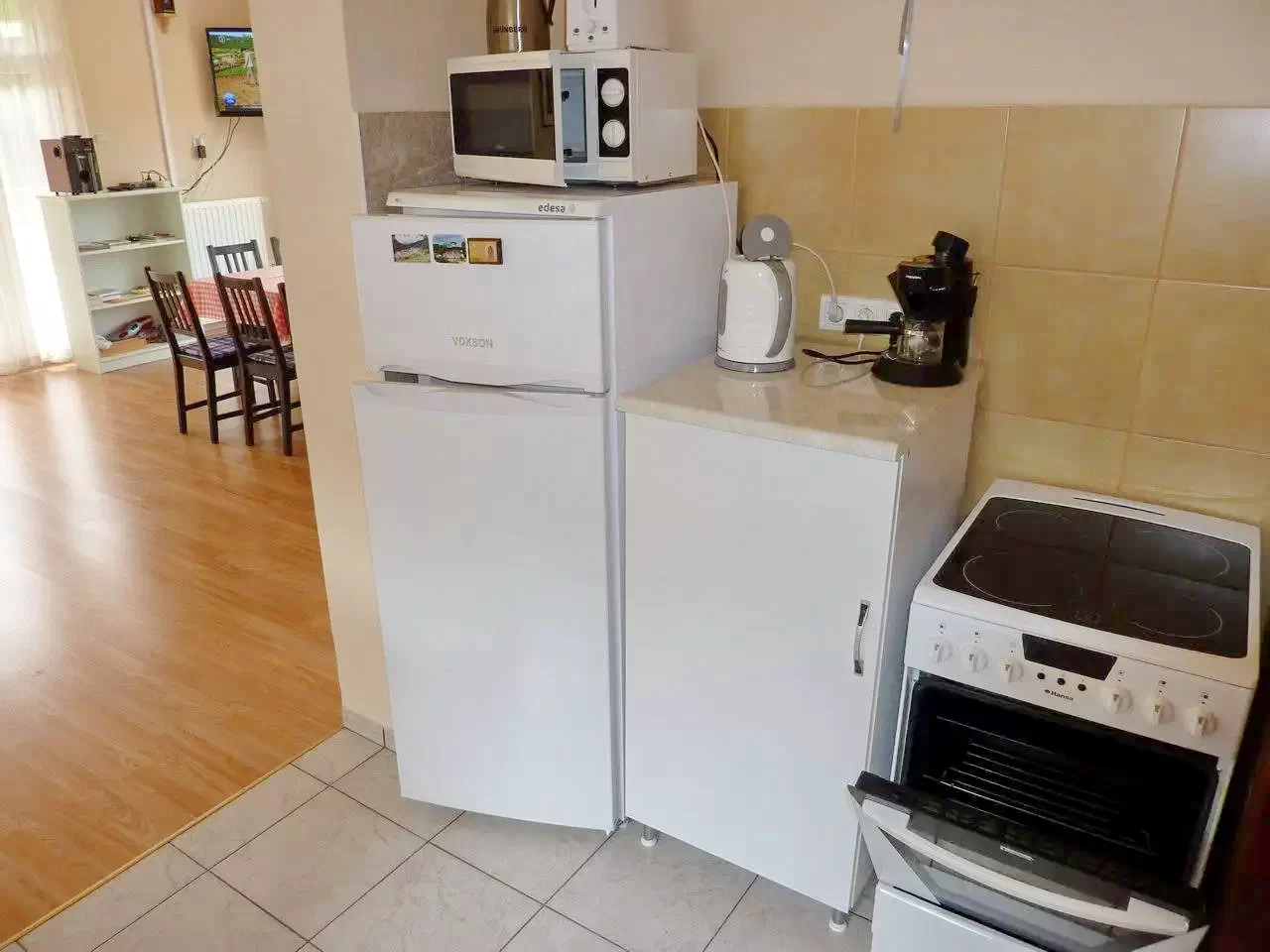 Konyha: Villanytűzhely, mosogatógép, hűtőszekrény, mikrohullámú sütő, kenyérpirító, kávéfőző, teafőző, edények, evőeszközök.