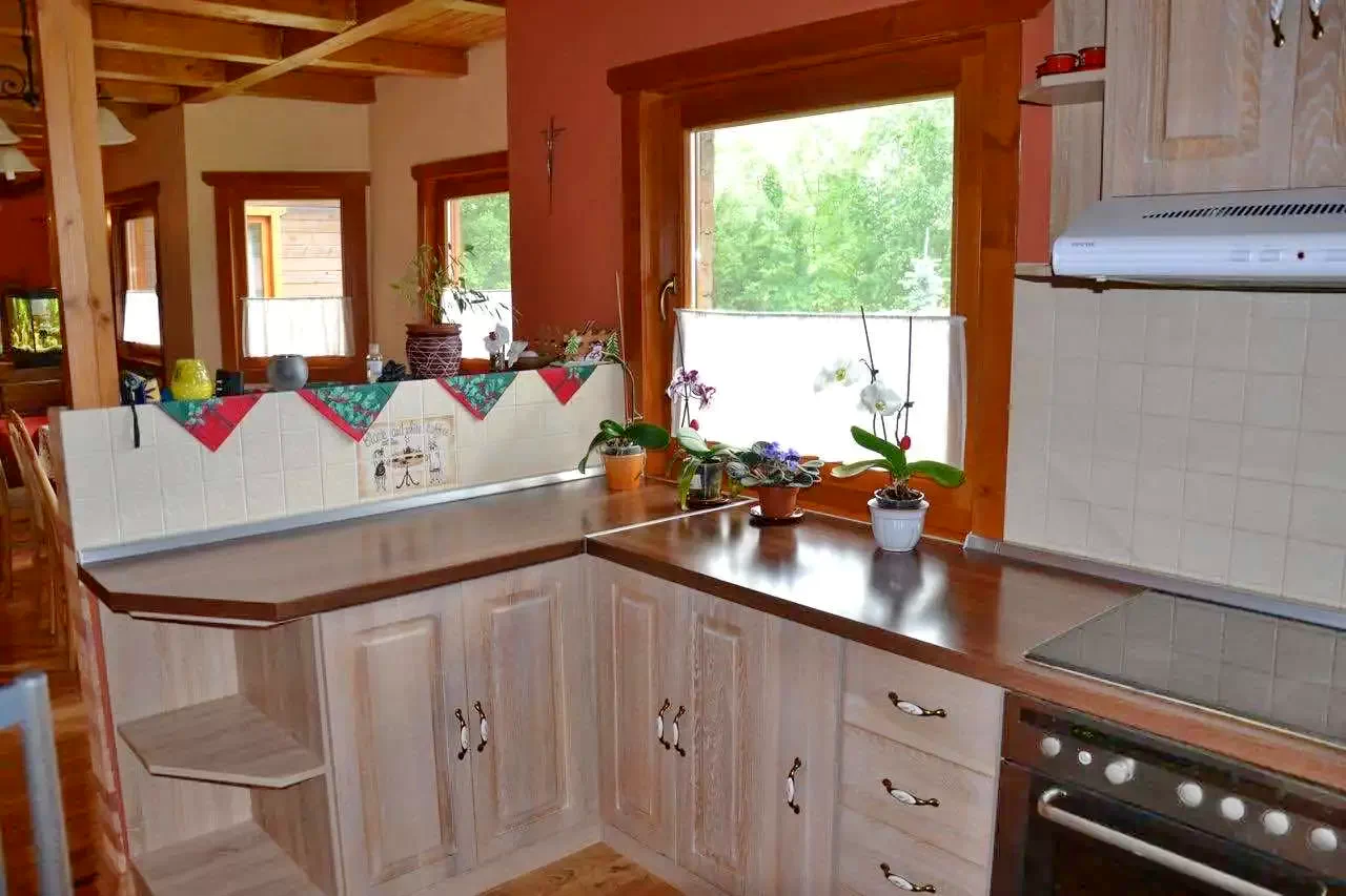 - A kulcsosházban egy modern, teljesen felszerelt konyha várja a vendégeket, elektromos sütővel, főzőlappal, mikrohullámú sütővel, hűtőszekrénnyel, kenyérpirítóval, kávéfőzővel, valamint edényekkel, evőeszközökkel és poharakkal.