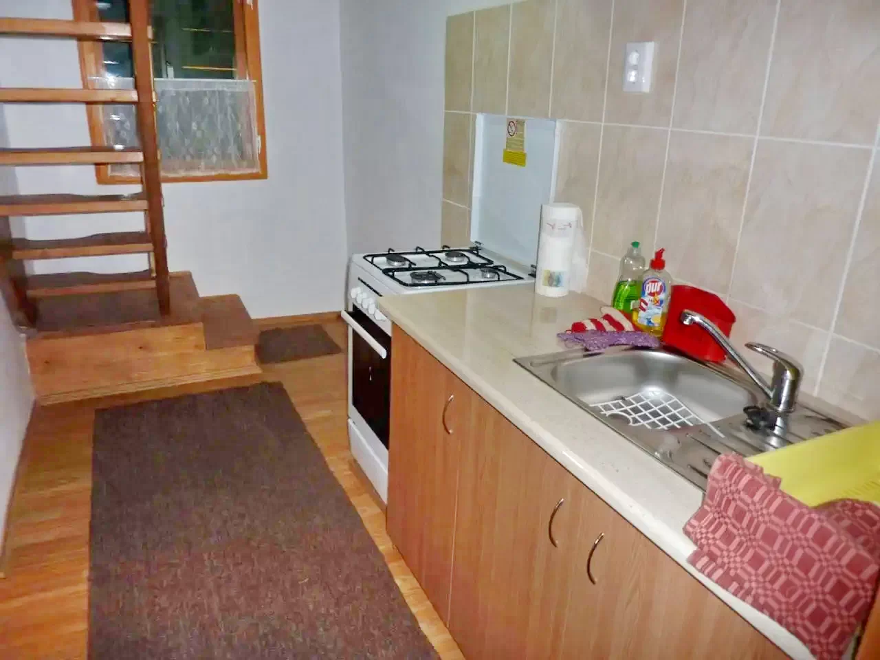 - A földszinten található egy nappali-ebédlő, egy felszerelt konyha, egy fürdőszoba (zuhanyzó, WC, mosdó), valamint egy nyitott szoba egy franciaággyal (2 fő).