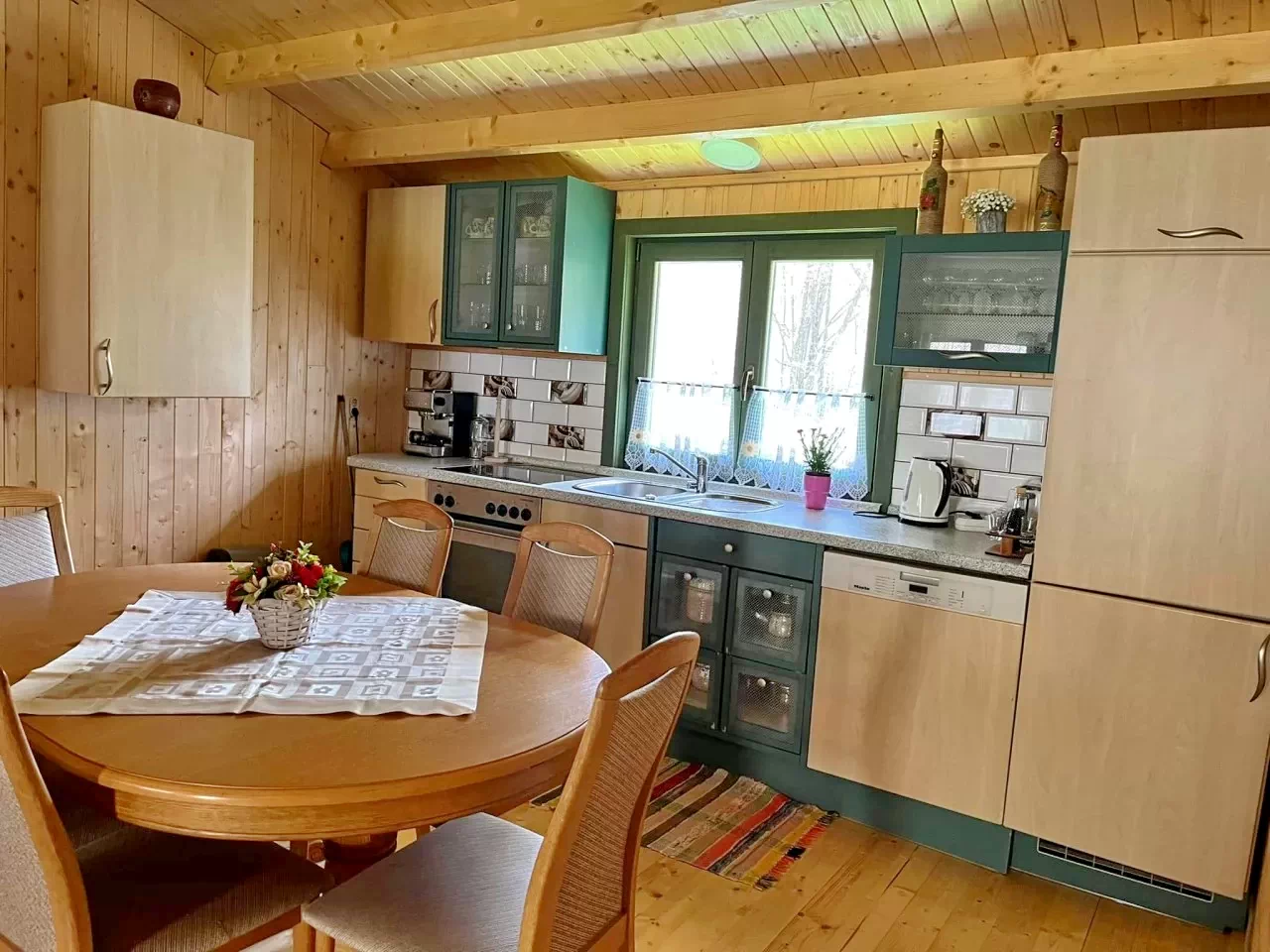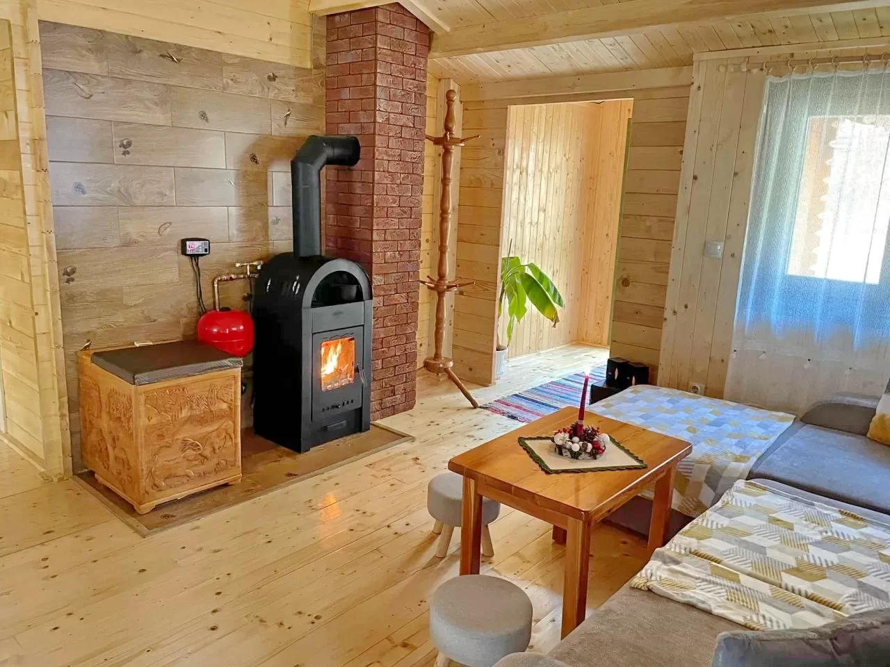 - A nappaliban található elegáns vízköpenyes kandalló fűtött időszakban a meleg vizet és a fűtést biztosítja. Nyárion a meleg víz szolgáltatása villanybojlerrel történik.