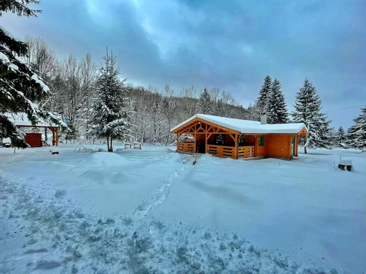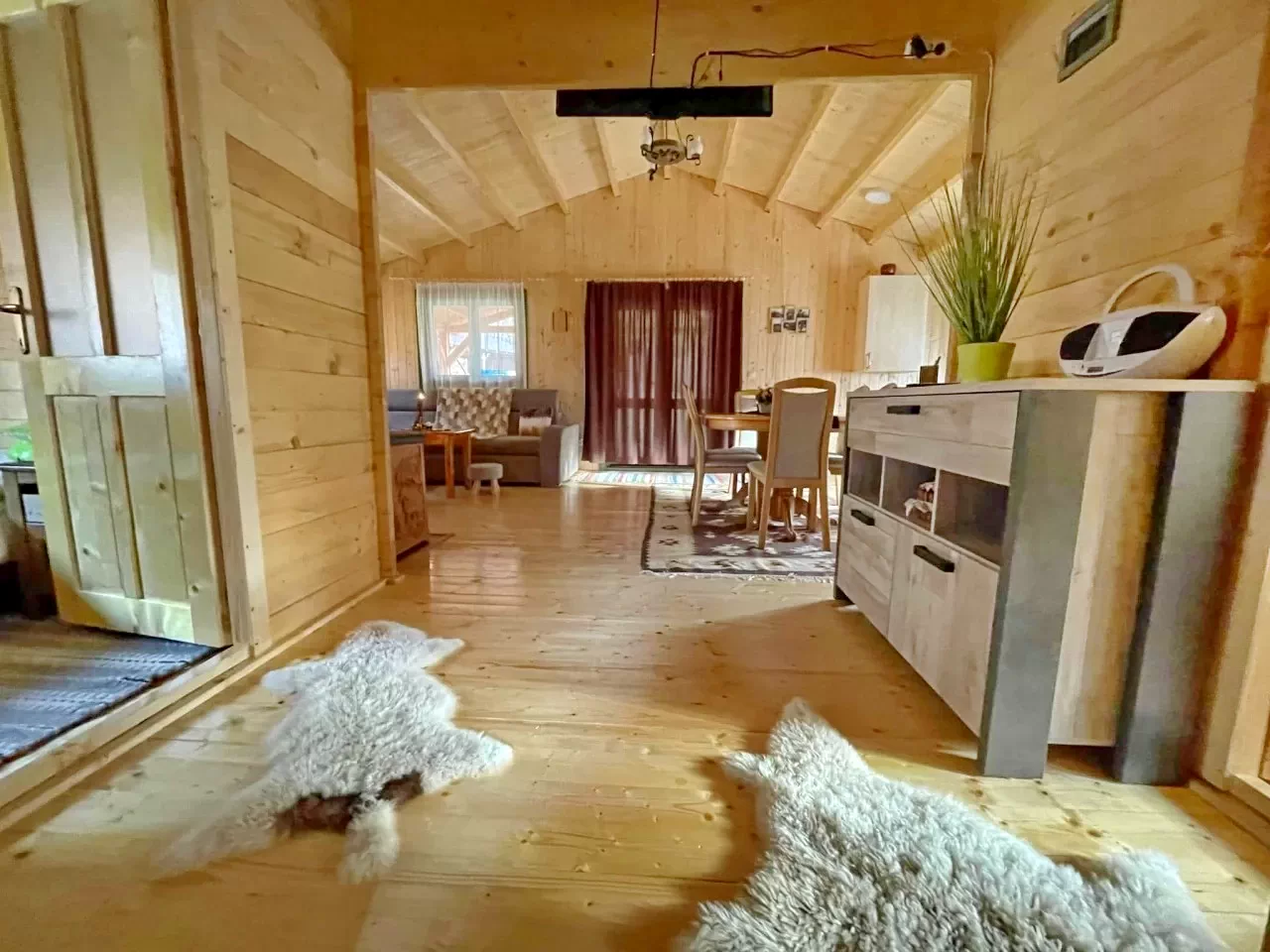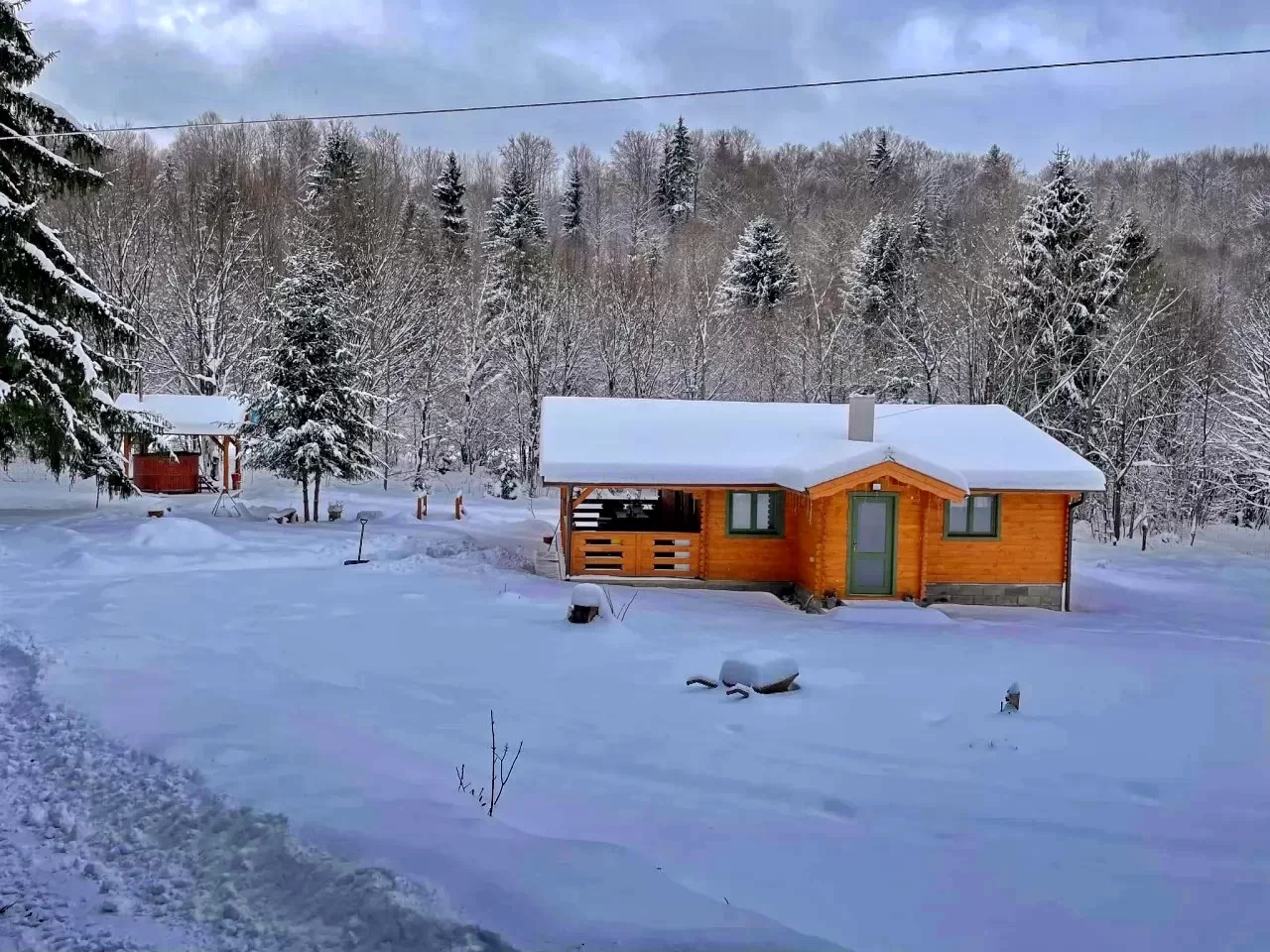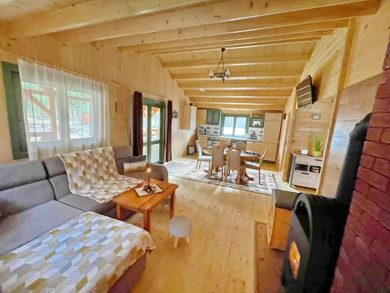 - A kulcsosház tágas, hangulatos kandallóval és tv-vel felszerelt nappalija, födött panorámás terasza számos beltéri program kiváló helye.
