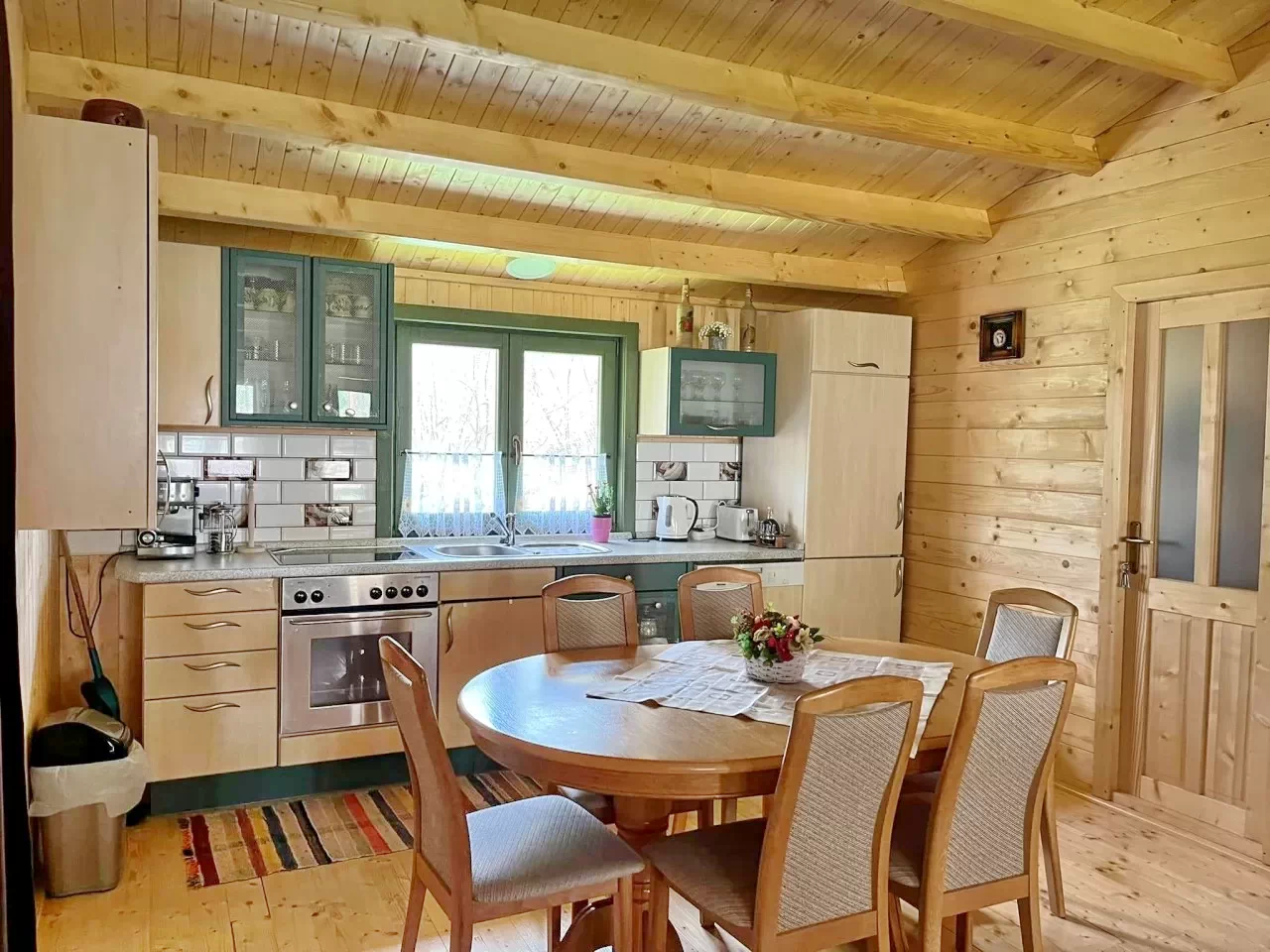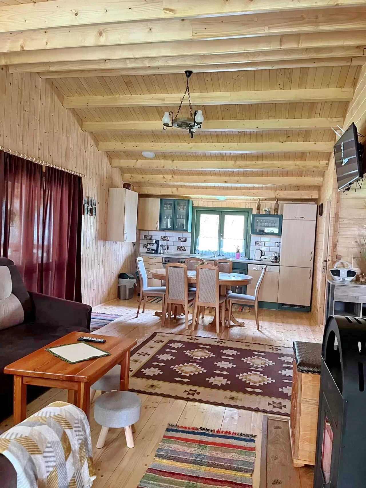 - A nagy étkező-nappali rész igényesen kialakított és felszerelt konyhával, kandallóval és tv-vel felszerelt.