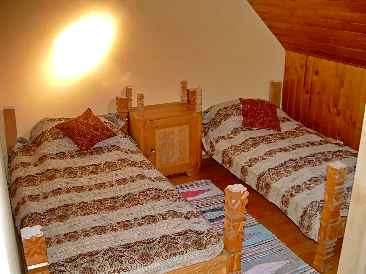 - Az emeletre egy meredek lépcső vezet, ahol két apartman helyezkedik el. Mindkét apartman két egylégterű szobából (szobánként egy-egy franciaágy, 2 fő) és egy-egy saját fürdőszobából (zuhanyzó, WC, mosdó) áll.
