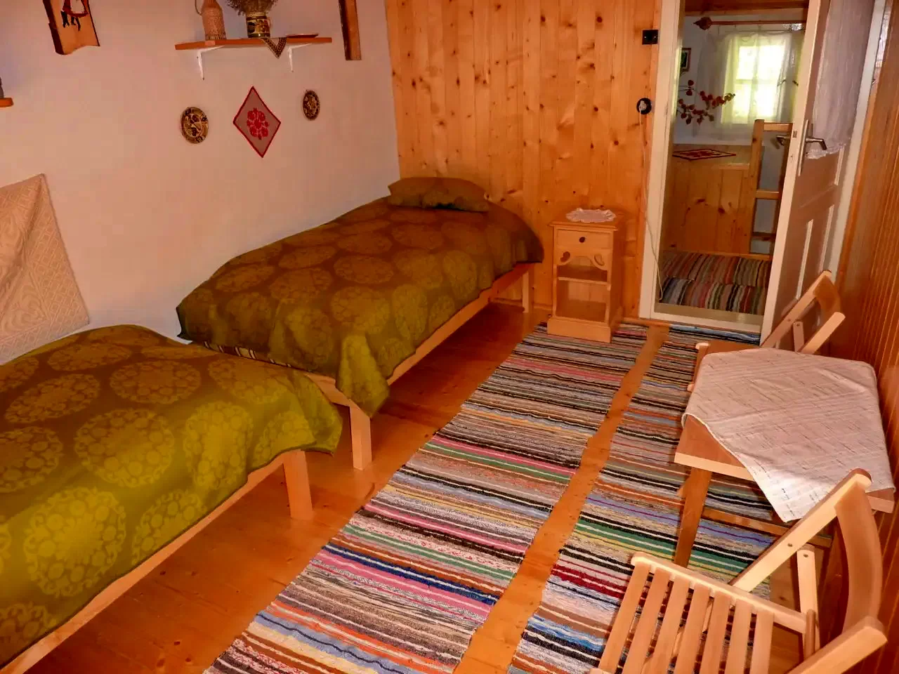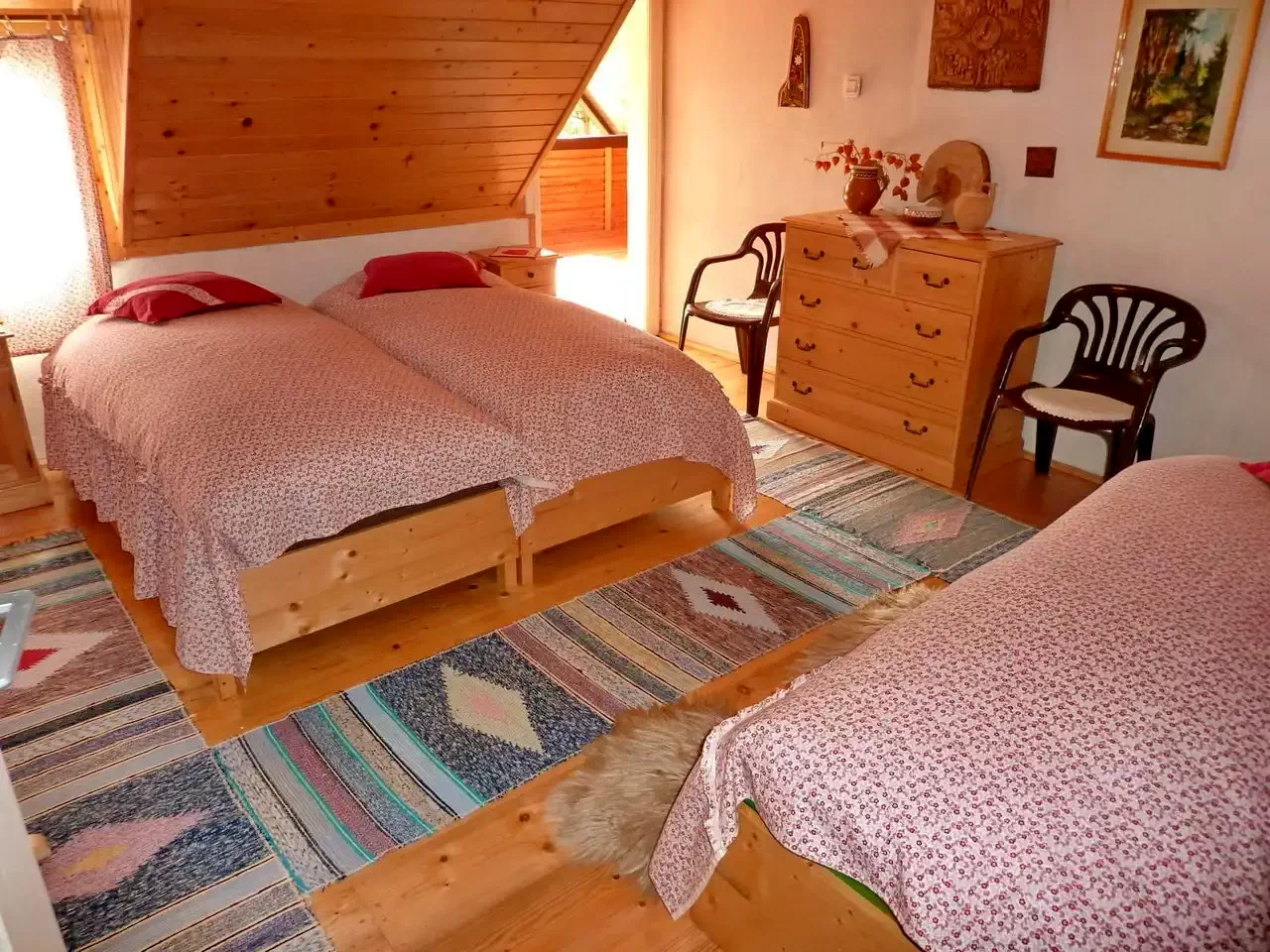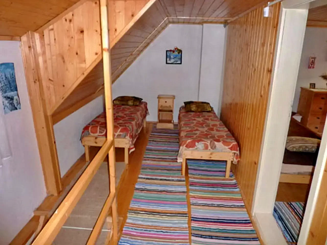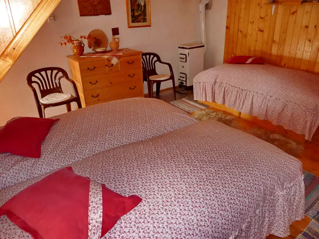 - Az emeleten két szoba: az egyik két egyszemélyes ággyal, a másik egy franciaággyal és egy egyszemélyes ággyal, utóbbi egy közös terasszal (az ikerház másik szárnyával megosztva). Nagyobb csoportok esetén az előtérben két pótágy áll rendelkezésre (nyitott tér).