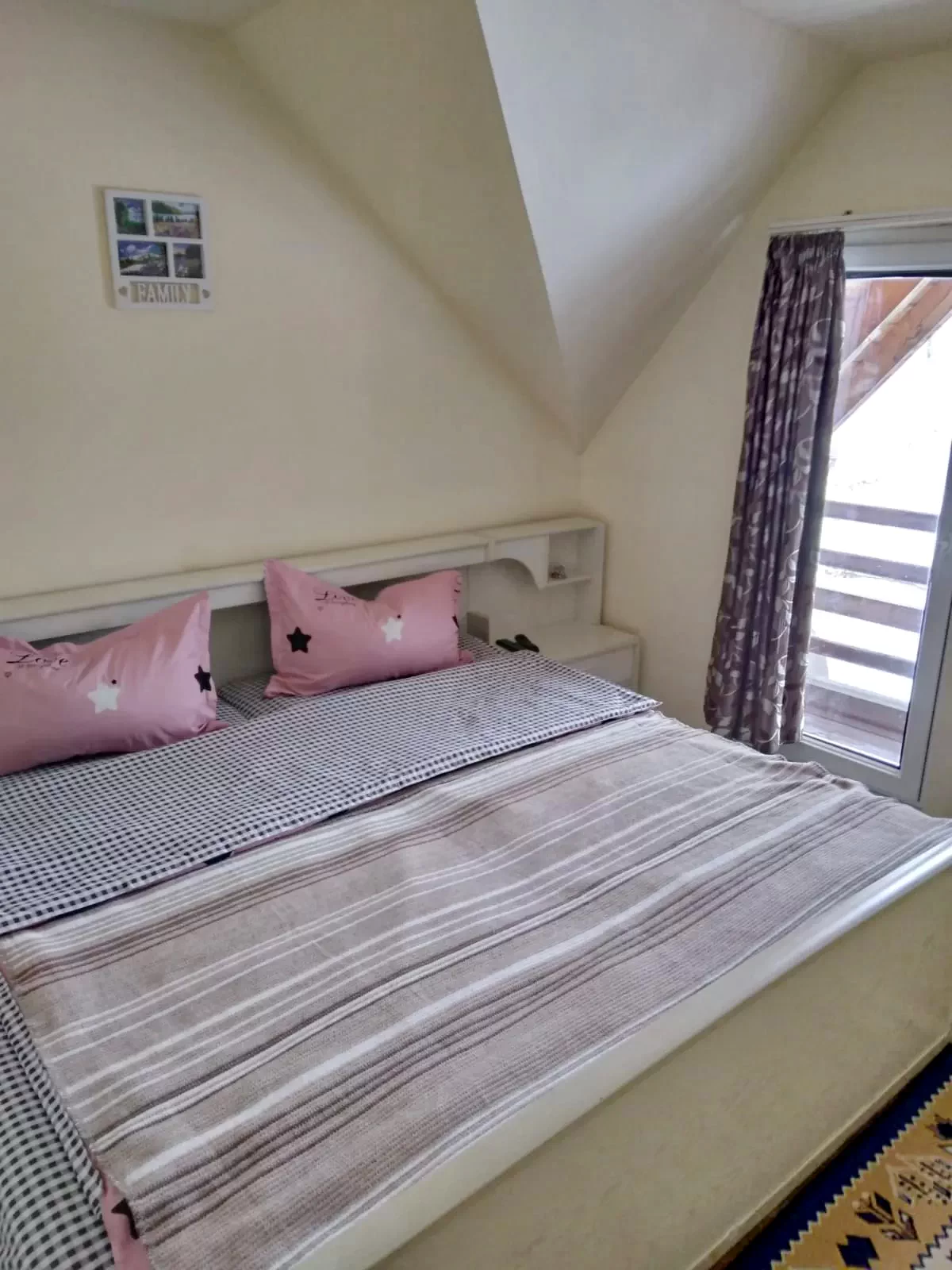 - Az emeleten 3 tágas szoba található, mindegyik TV-vel felszerelve, ebből kettő erkélyes, ahonnan gyönyörű kilátás nyílik a környező hegyekre és a kertre. A három szoba egy közös, modern fürdőszobát használ.