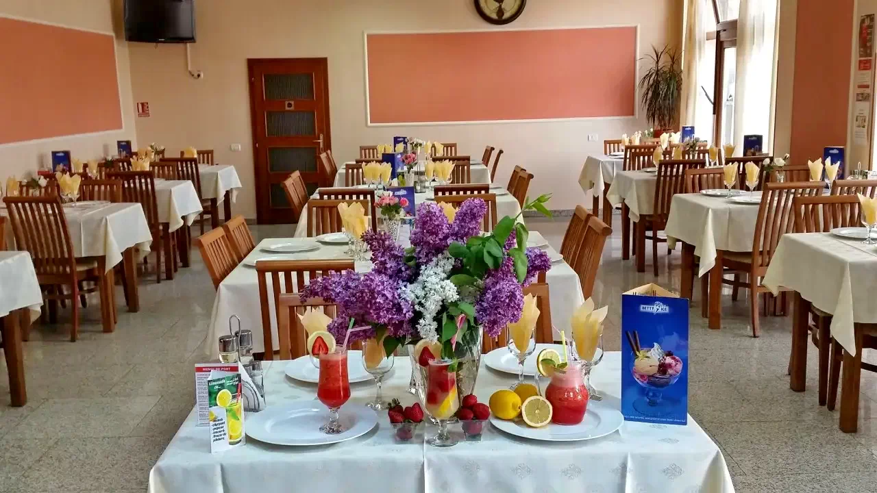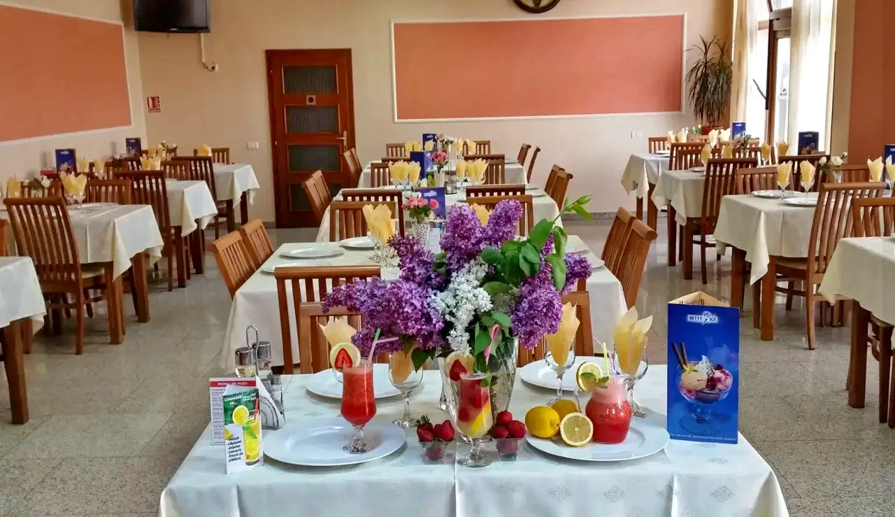 A 60 fő befogadására alkalmas étterem hagyományos és nemzetközi ételeket kínál, a la carte vagy csoportos ellátással (reggeli, félpanzió, teljes ellátás). Katering szolgáltatás igény szerint elérhető.