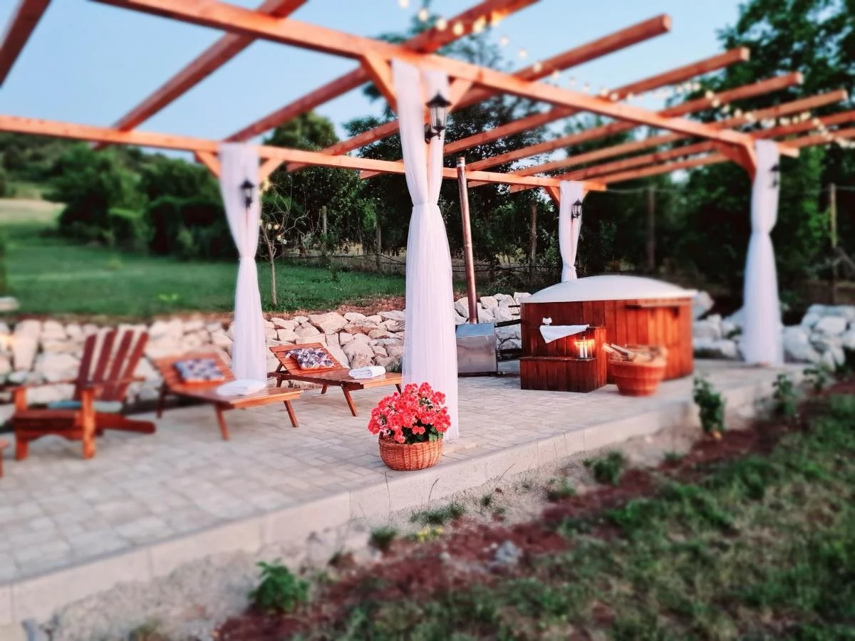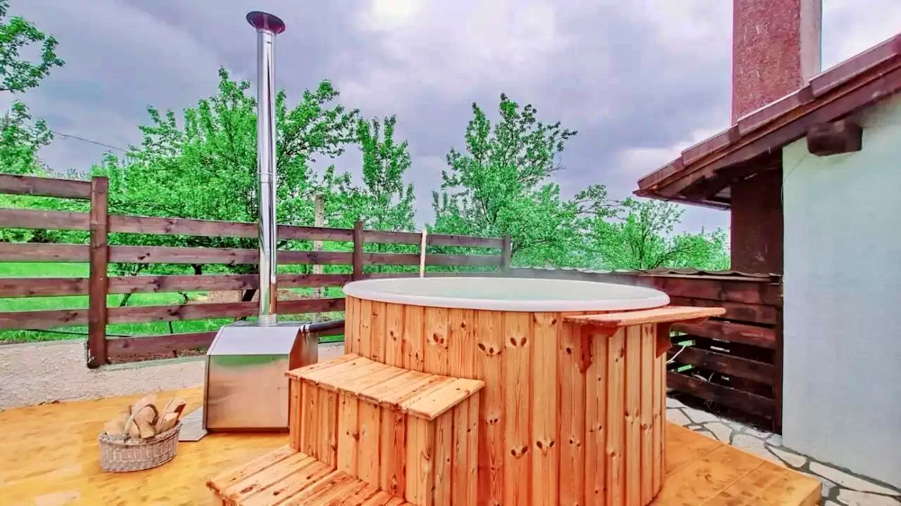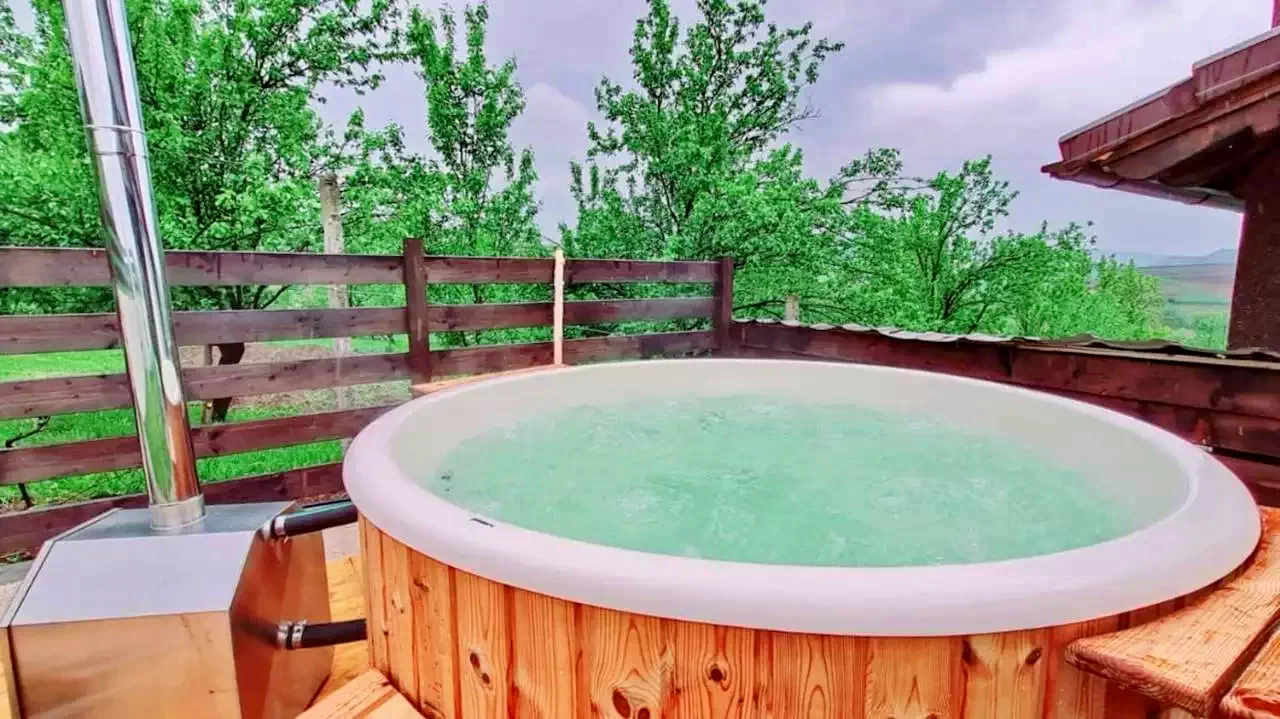 - A tökéletes szabadtéri pihenéshez a vendégház egy modern dézsafürdőt kínál üvegszálas belsővel rendelkező, fűtésrendszerrel, aeromasszázs rendszerrel, környezeti világítással és kvarchomok vízszűrő rendszerrel.