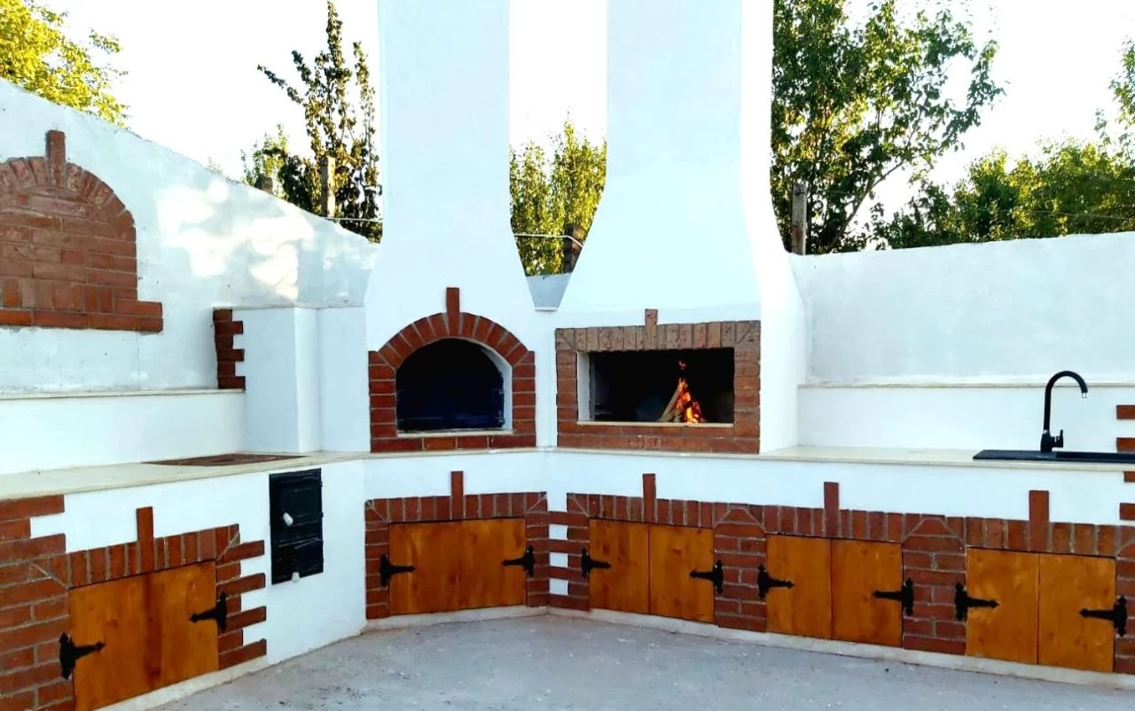 - A vendégeknek szánt fedett kültéri terasz nagyon kényelmes és pihentető kerti bútorokkal felszerelt, melytől egy kövezett ösvény vezet a kerti sütés-főzés számára kialakított takaros kemence, illetve sütő (grill, bogrács) felülethez