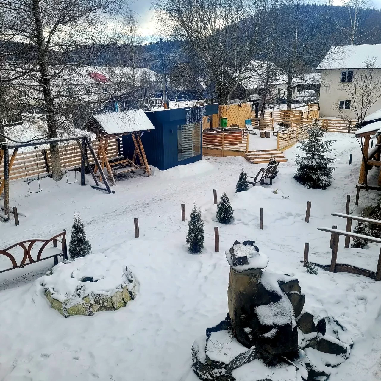 - A panziókert kifejezetten gyermekek számára készült, néhány játékhintával és egy kis artéziai szökőkútdal.