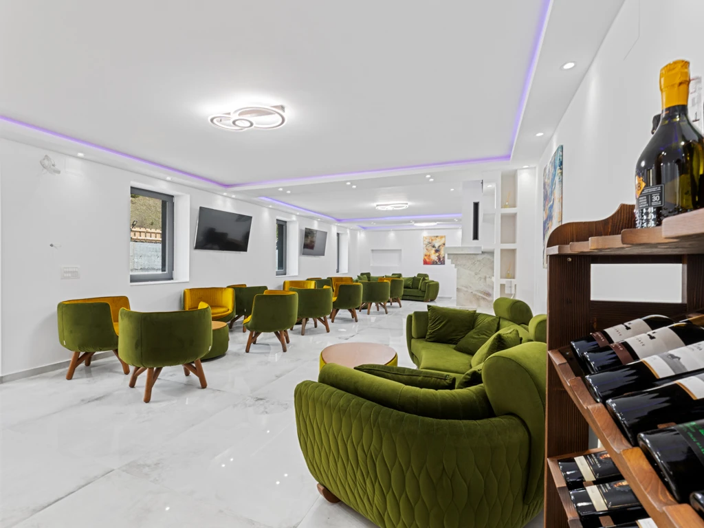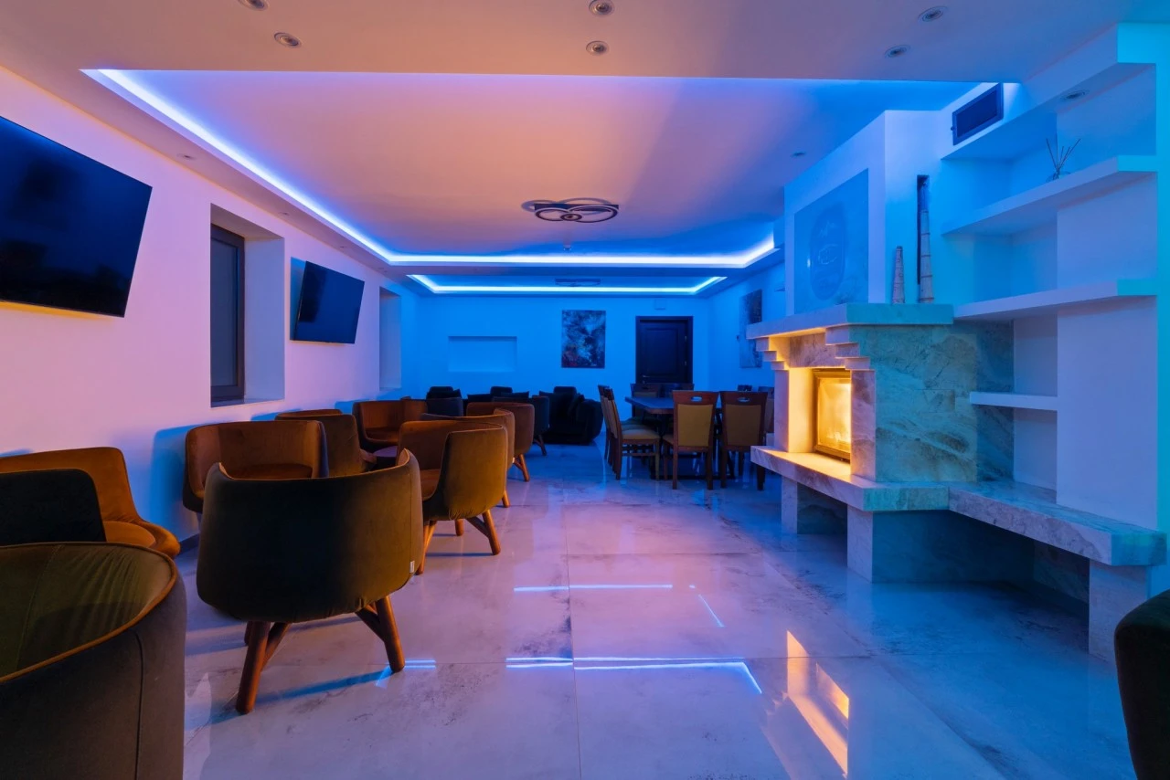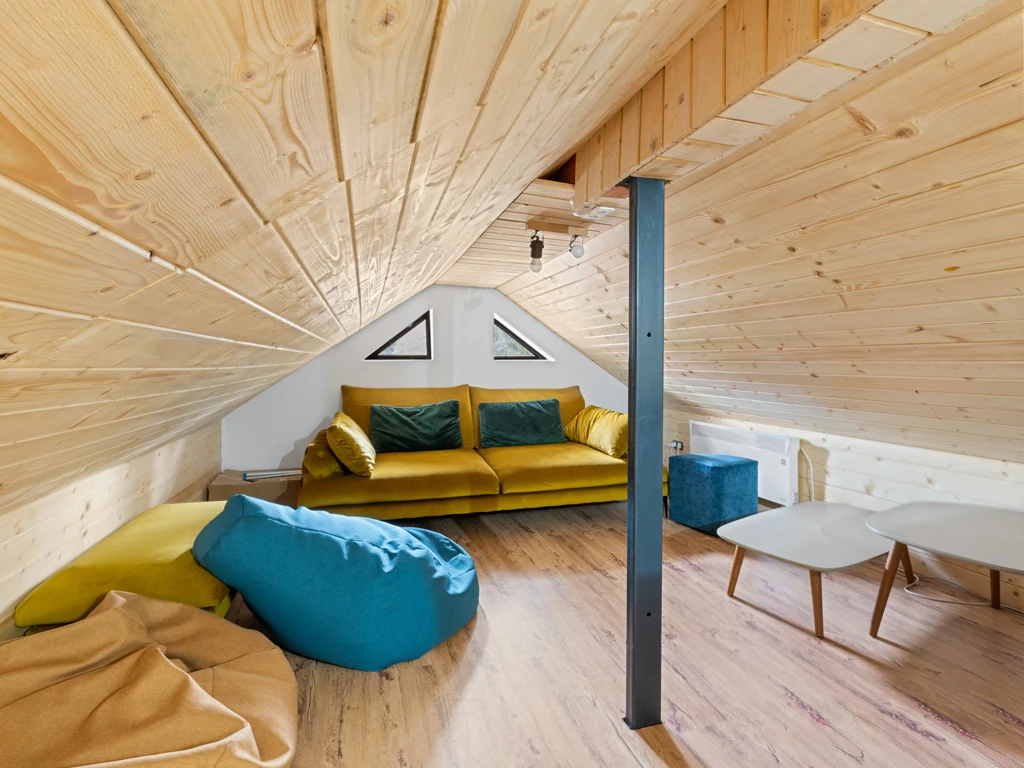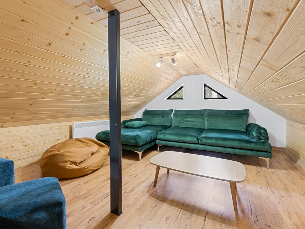 Nagy, tágas nappali kandallóval, ideális a társasági élethez, beszélgetésekhez, esetleges tematikus partikhoz.