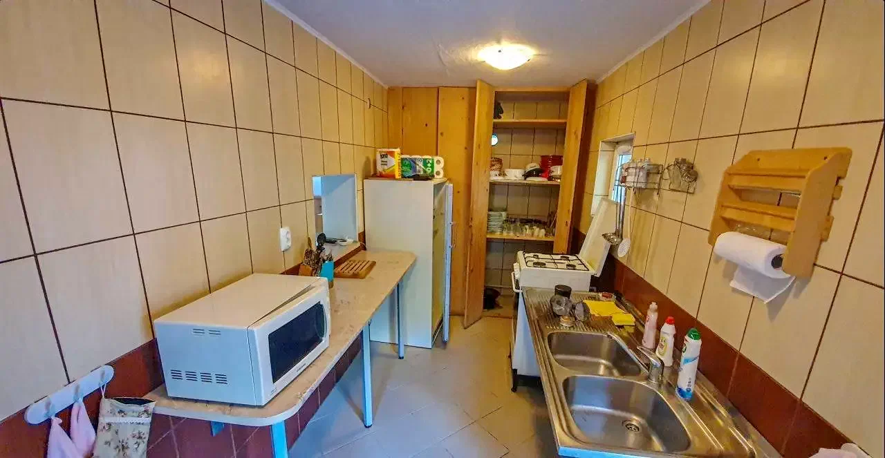 - A földszinten található egy tágas nappali-ebédlő 20–25 férőhellyel, egy teljesen felszerelt konyha és két toalett (WC-vel és kézmosóval).