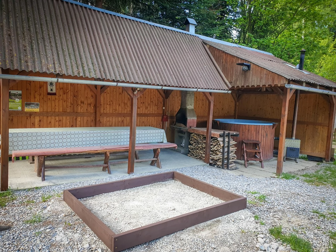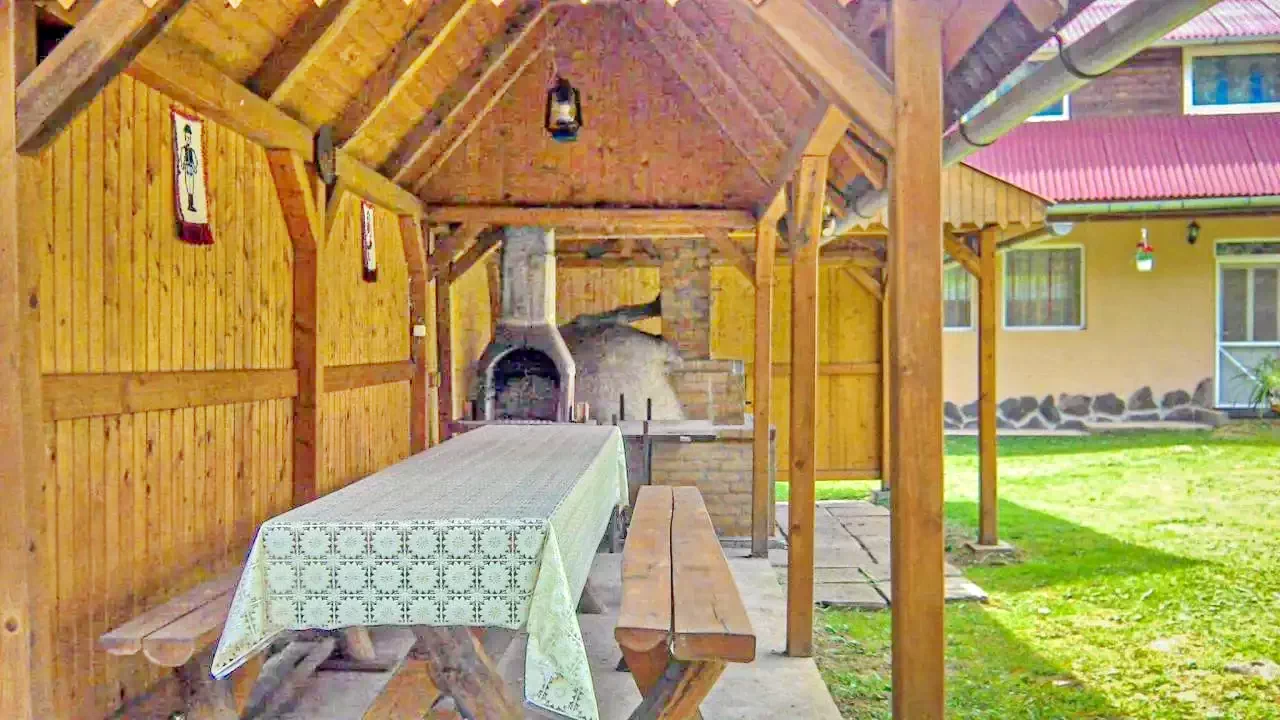 - Az udvaron található fedett filagória tökéletes helyszín szabadtéri étkezésekhez, ahol a flekkensütő, bogrács, tárcsalap és a házikenyér-sütő kemence garantálja a gasztronómiai élményeket.