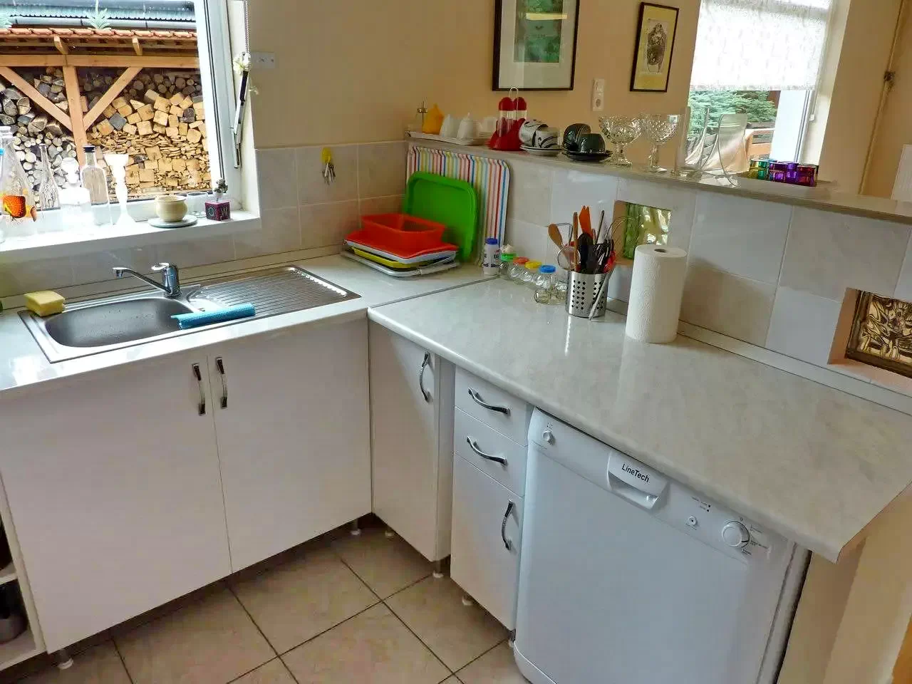 - A kulcsosházban a vendégek rendelkezésére áll egy modern, teljesen felszerelt konyha, amely villanytűzhellyel, mosogatógéppel, hűtőszekrénnyel, mikrohullámú sütővel, kenyérpirítóval, kávéfőzővel, teafőzővel, valamint edényekkel és evőeszközökkel várja az önellátó vendégeket.