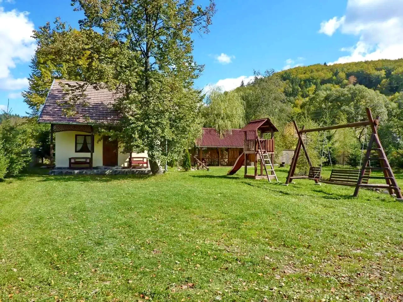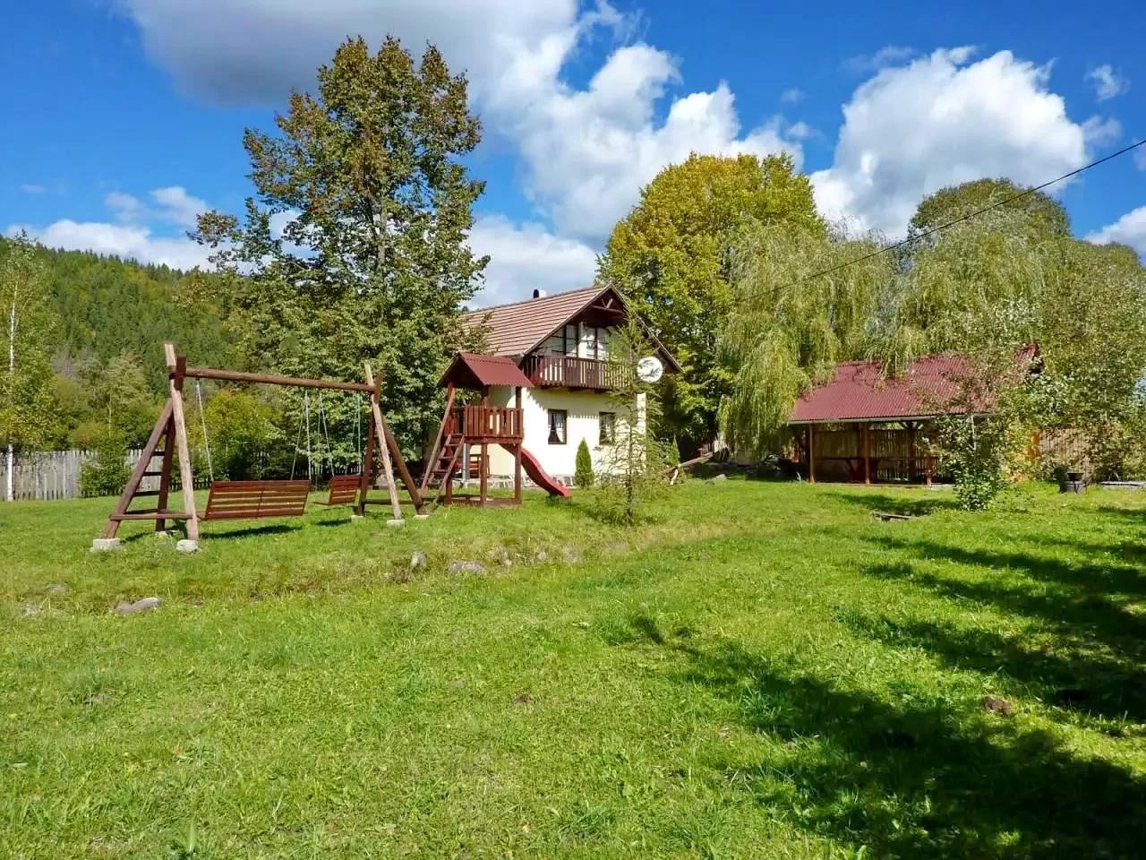 Udvar (1200 m²): Fedett söröző, kerti kiülő, terasz, napozóágy, hinta, lipinka, csúszda, homokozó.