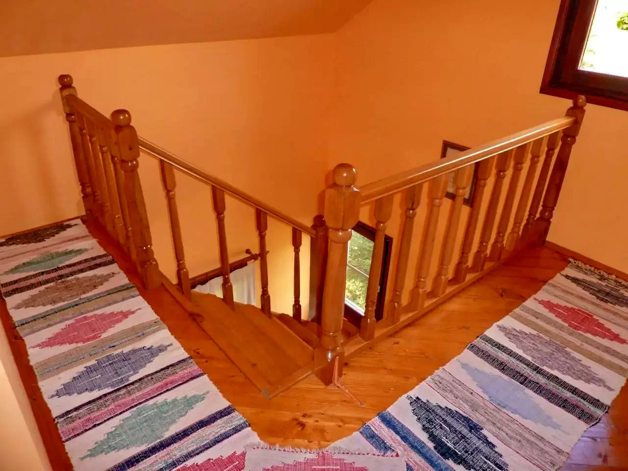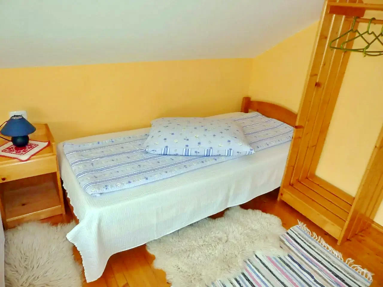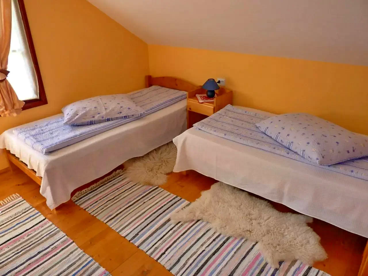 - Az emeleten három szoba, mindegyik két egyszemélyes ággyal, biztosít nyugodt pihenést.