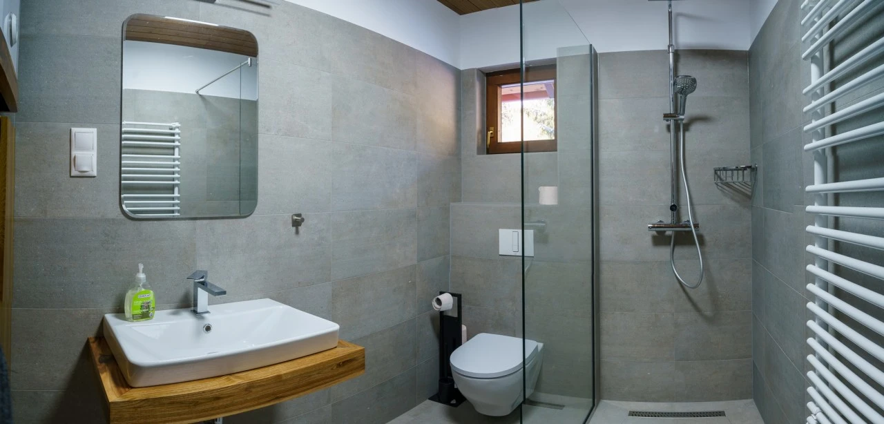 Frissen felújított fürdőszobák az apartmanokban (zuhanyzó, WC); a villában hat fürdőszoba káddal/zuhanyzóval, hajszárítóval, törölközőkkel, vendég-WC-vel.