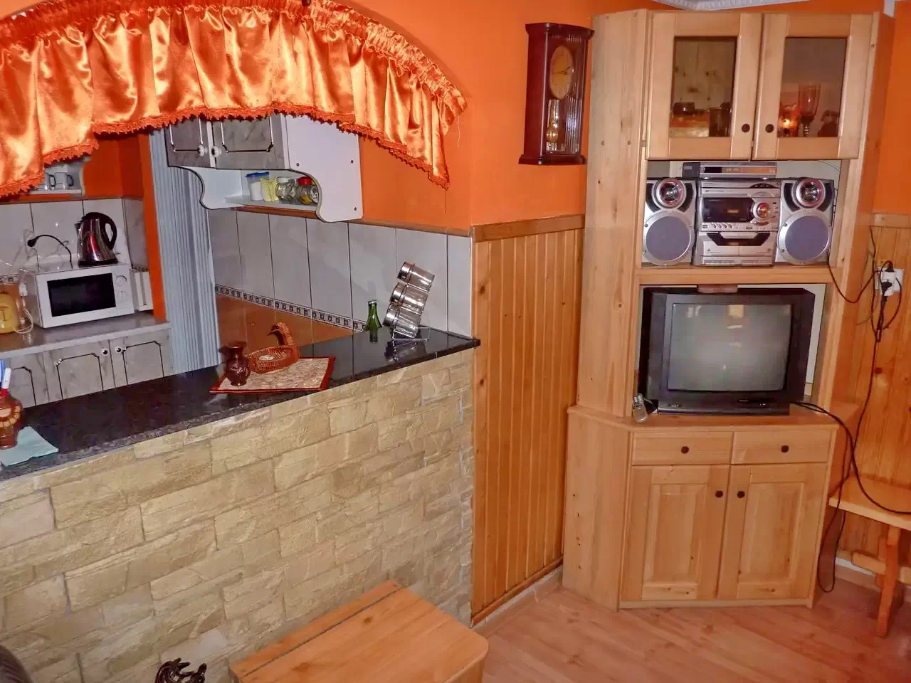 - A szálláshelyen minden megtalálható a gondtalan pihenéshez: TV műholdas csatornákkal, CD-lejátszó, ágynemű, mosógép, kéztörlő, valamint a modern konyha (gáztűzhely, mosogatógép, hűtőszekrény, mikrohullámú sütő, kenyérpirító, kávéfőző, edények, evőeszközök).