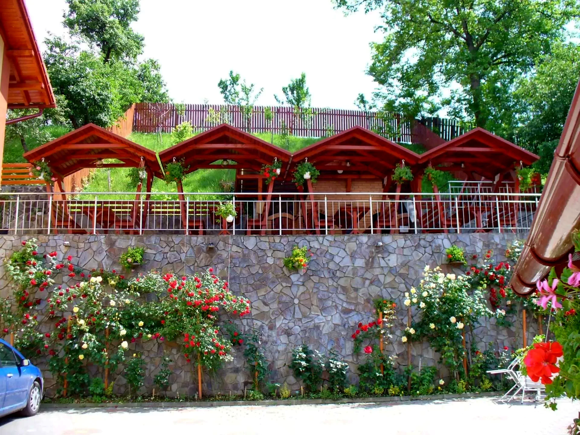 - A panzió udvara egy gyönyörű kilátást kínáló területtel várja, ahol 2 grillező, pizzakemence, 4 nyolcfős filagória, valamint négyfős asztalok székekkel biztosítanak lehetőséget a kinti étkezésre.