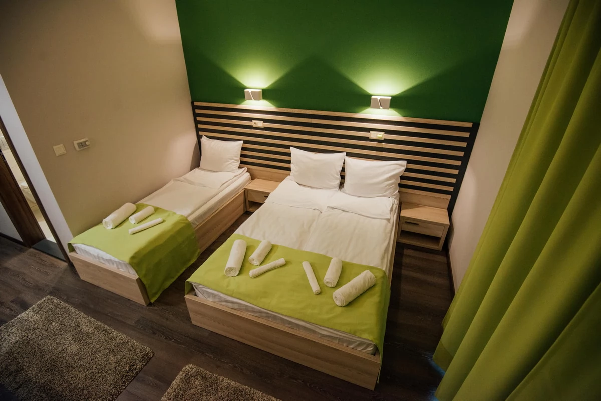 - Az apartmanok kétszemélyes hálószobát (pótágyazási lehetőséggel), nappalit (kétszemélyes kanapéval) és privát fürdőszobát kínálnak, tökéletes választás családoknak vagy pároknak.