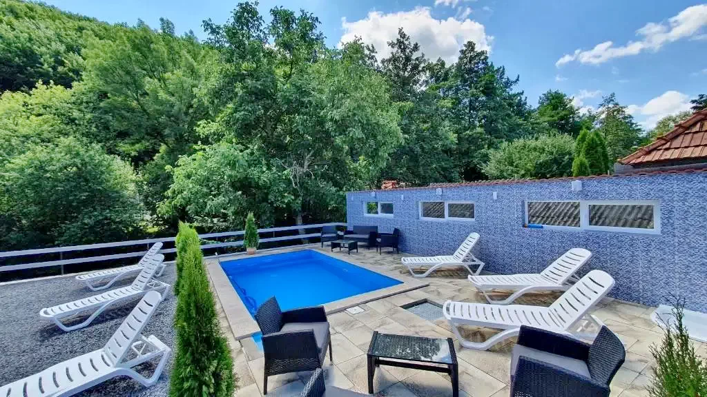 - A kellemes kikapcsolódásról a kertben található medence, valamint a tornácon kialakított lazításra alkalmas függőhinták és padok gondoskodnak.