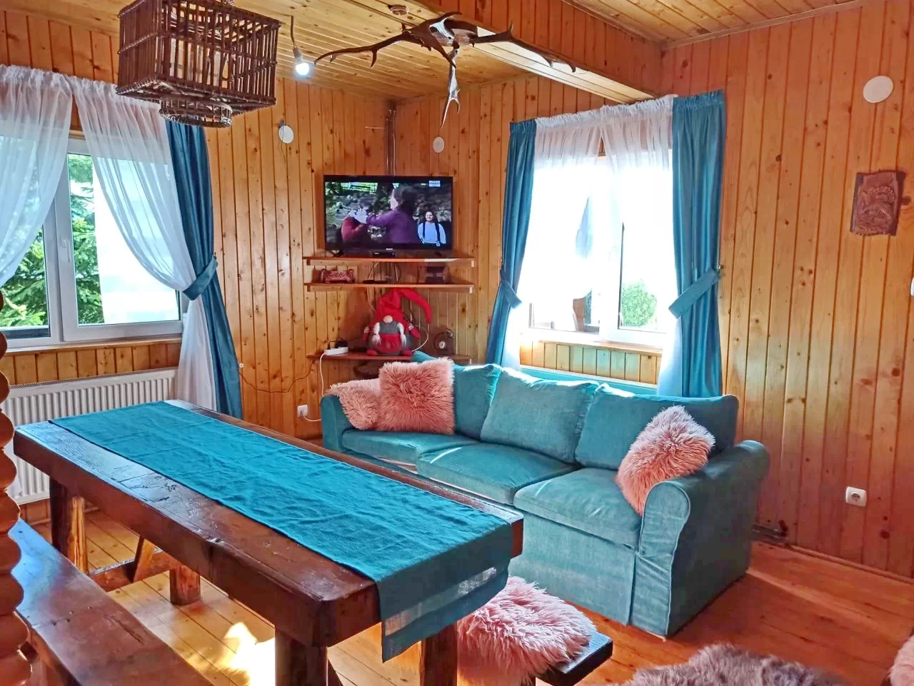 Nappali: kandalló, TV, kihúzható kanapé