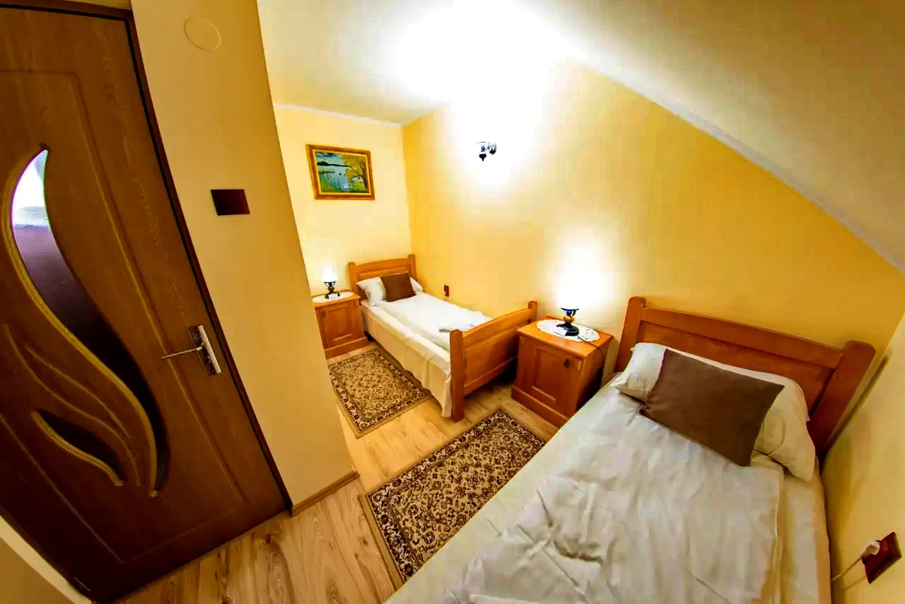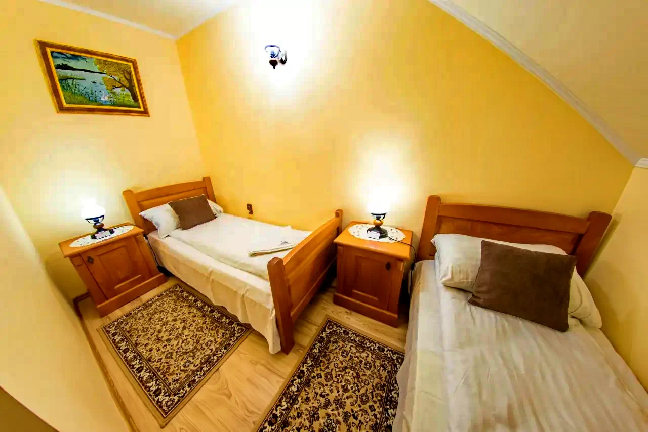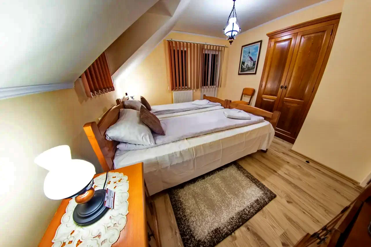 - 3 db kétágyas szoba (a földszinti átjáros, az emeleten egy kisebb és egy nagyobb szoba);