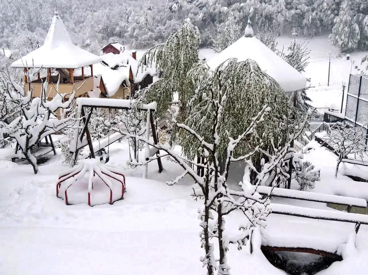 - A parkosított kertben játszótér, pihenőhinták és faragott erdei állatfigurák várják a vendégeket.