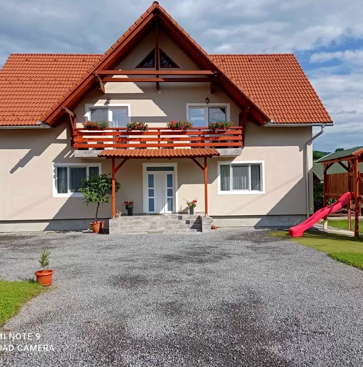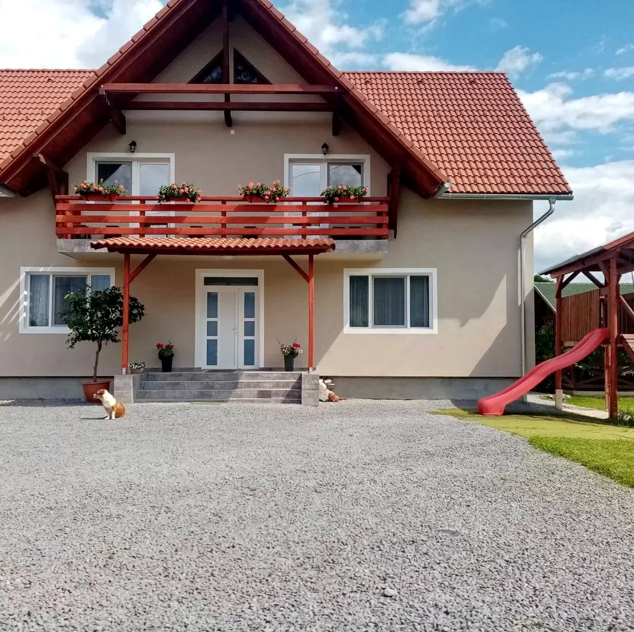 Az udvaron talalható parkoló, 12 személyes nyari kert, kerti sütő, mini focipálya, csocsó asztal, trambulin és gyerek csuszda.