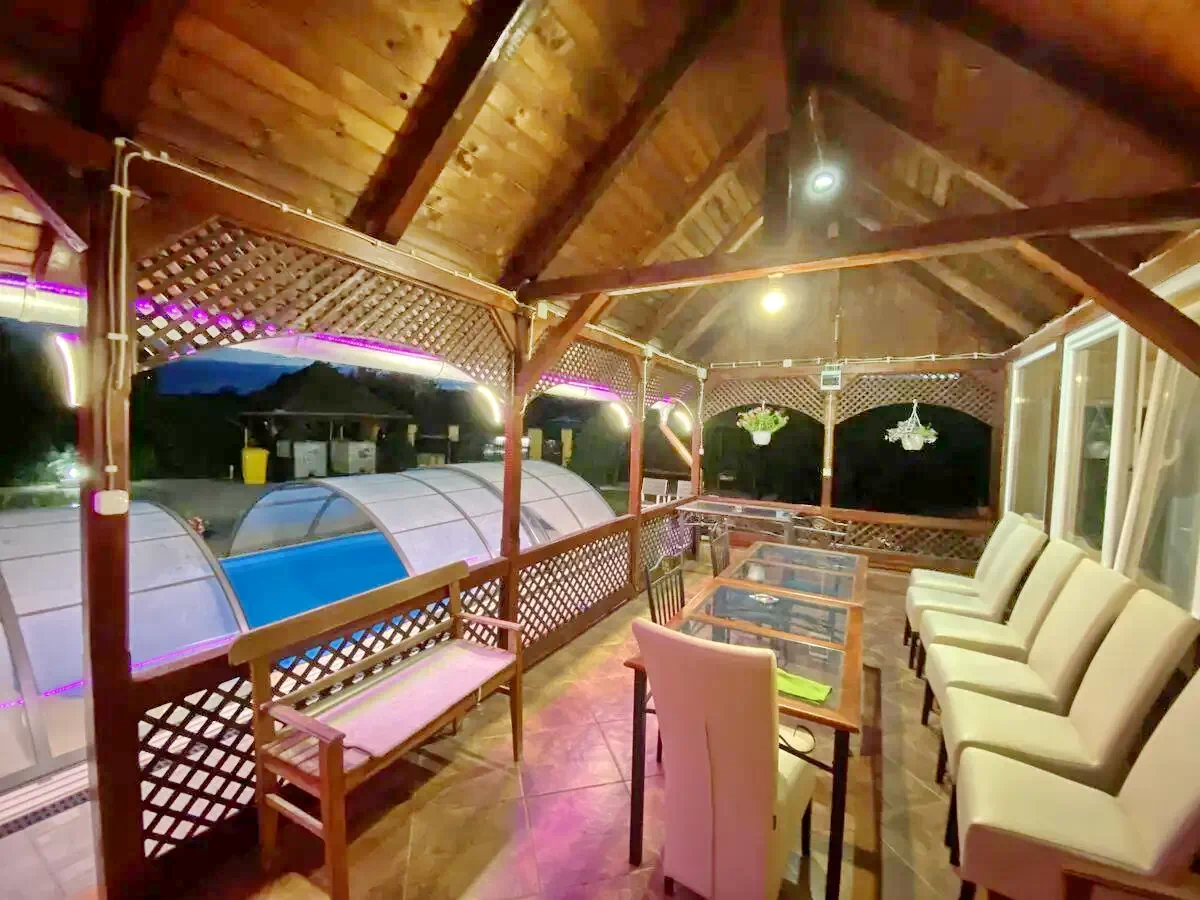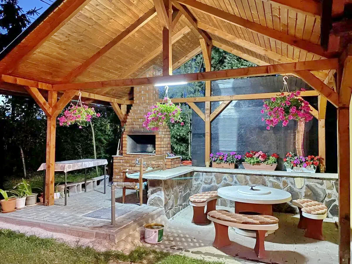 - Tágas parkosított udvarán fedett pavilont, kemencét, grill, bogrács lehetőséget kínál. Felnőtteknek és gyerekeknek további játszótér, hinta, illetve relaxációs terület áll rendelkezésére.