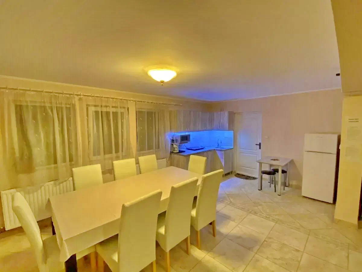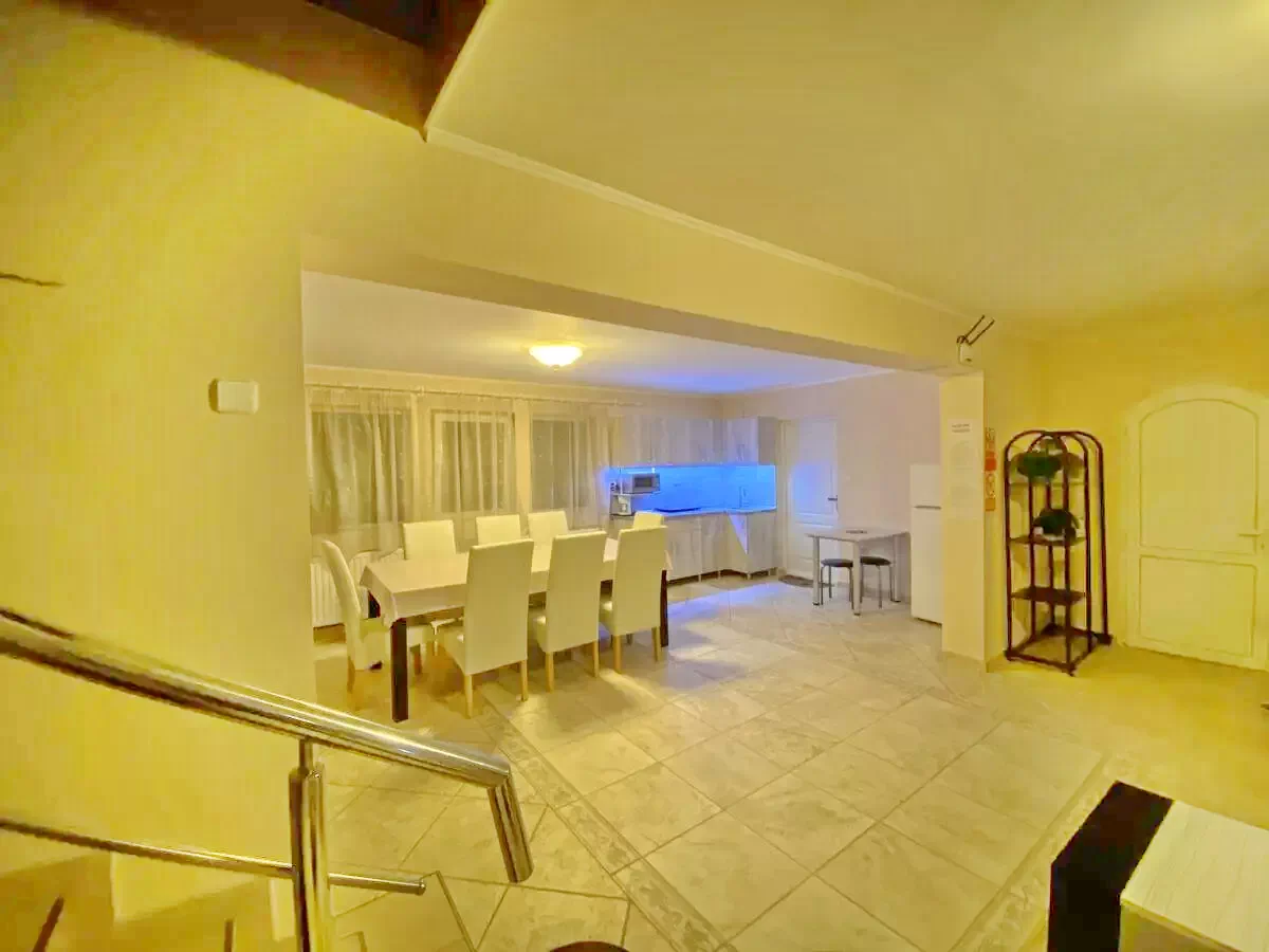 A földszinten modern felszerelt konyha, 54 nm-es nappali található rendkívül elegáns berendezéssel, tv-vel, vezeték nélküli internettel, valamint nagy asztallal mely privát összejövetelek, illetve ünnepélyek alakalmából nagy sikernek örvend.