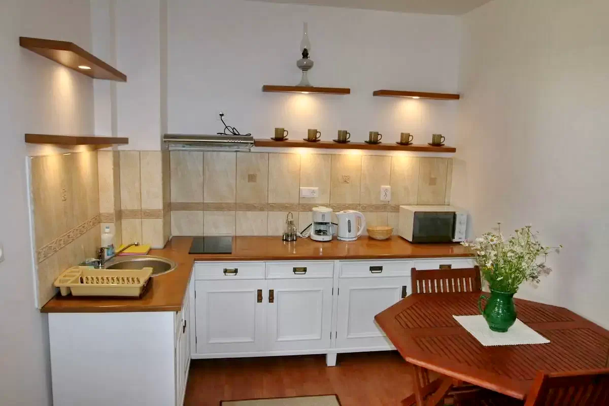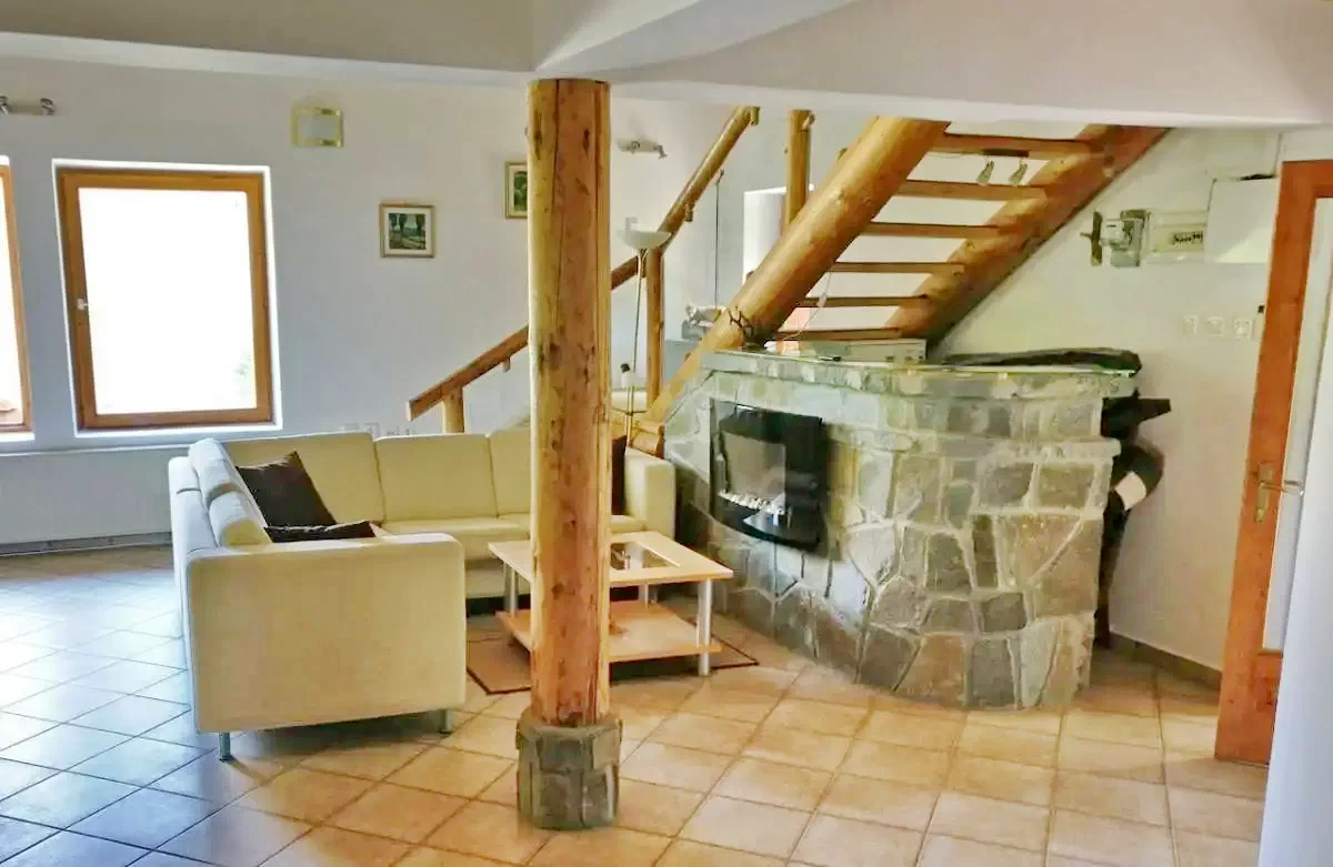 - Az alsó szinten egy lakrész és a középkori hangulatot árasztó, közel 100 m2-es nappali, illetve ebédlő (gáztűzhely, jól felszerelt konya, hűtőszekrény) teszi kellemessé, kényelmessé és emlékezetessé az itt eltöltött időt.