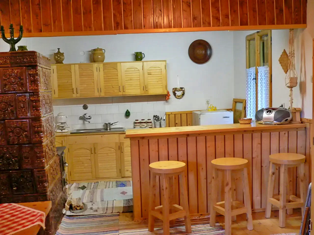 - A fűtést csempekályha és konvektor biztosítja, a meleg vizet elektromos bojler.