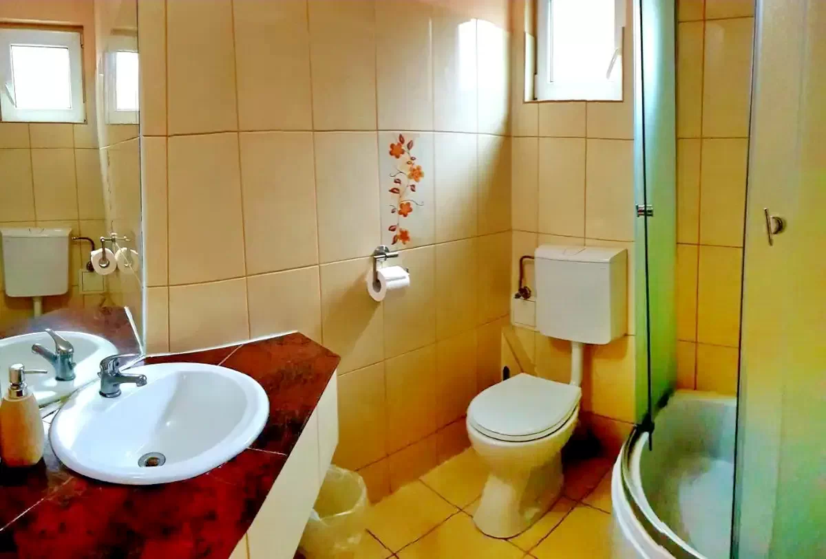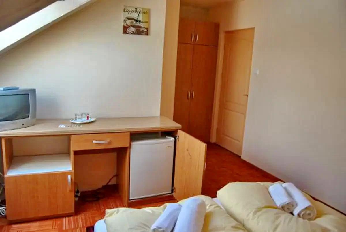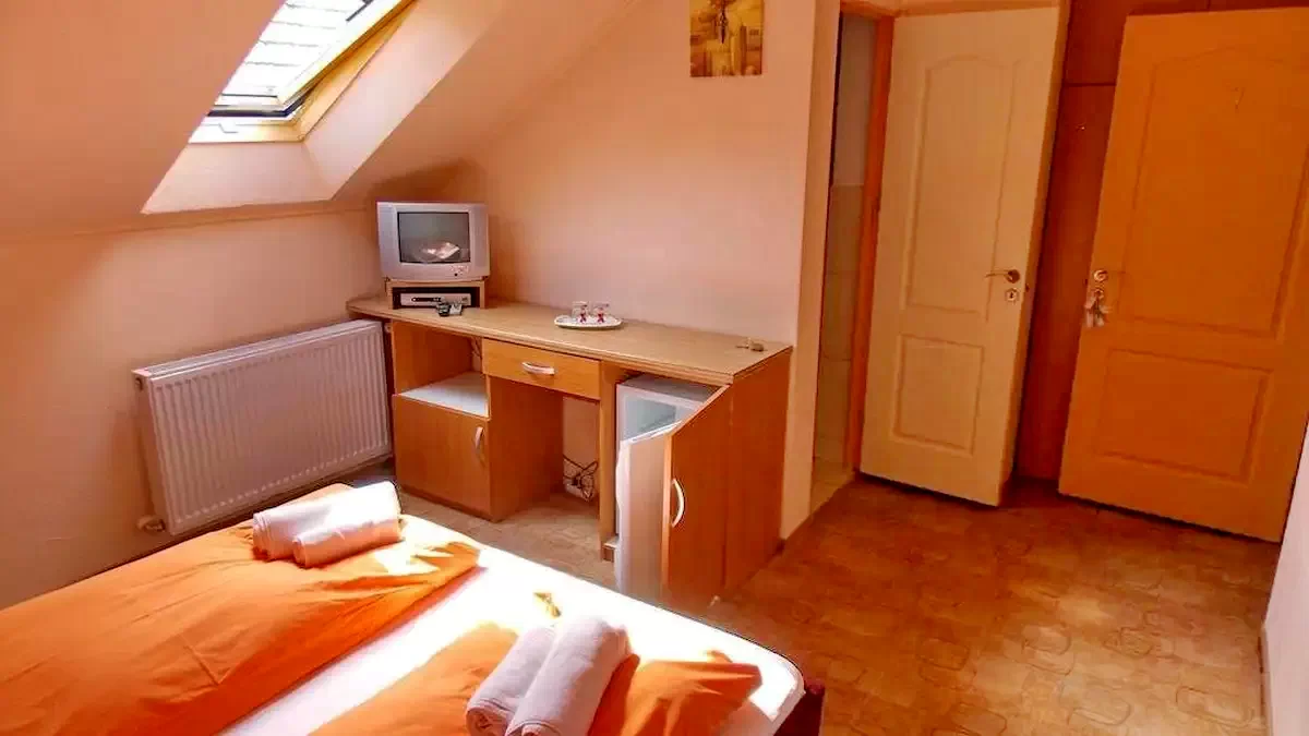 - 6. szoba (Economy dupla): 2 fő, saját fürdőszoba, TV, hűtőszekrény, Wi-Fi, központi fűtés.