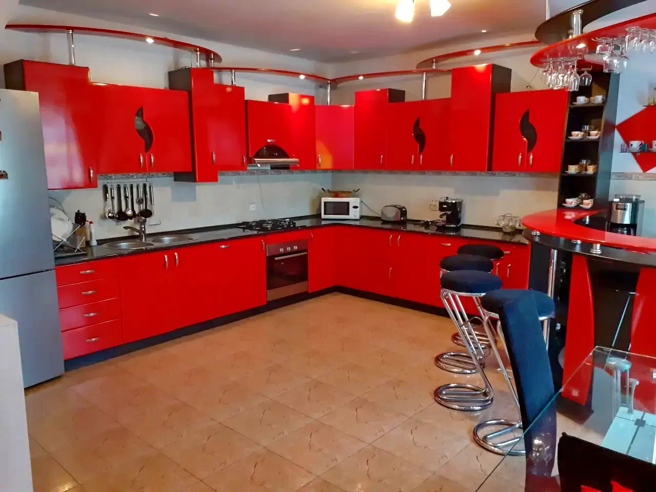 A villa rendelkezik modern, teljesen felszerelt konyhával, valamint hangulatos, elegáns, panorámás nappalival, amelyben kétszemélyes kanapé is található.