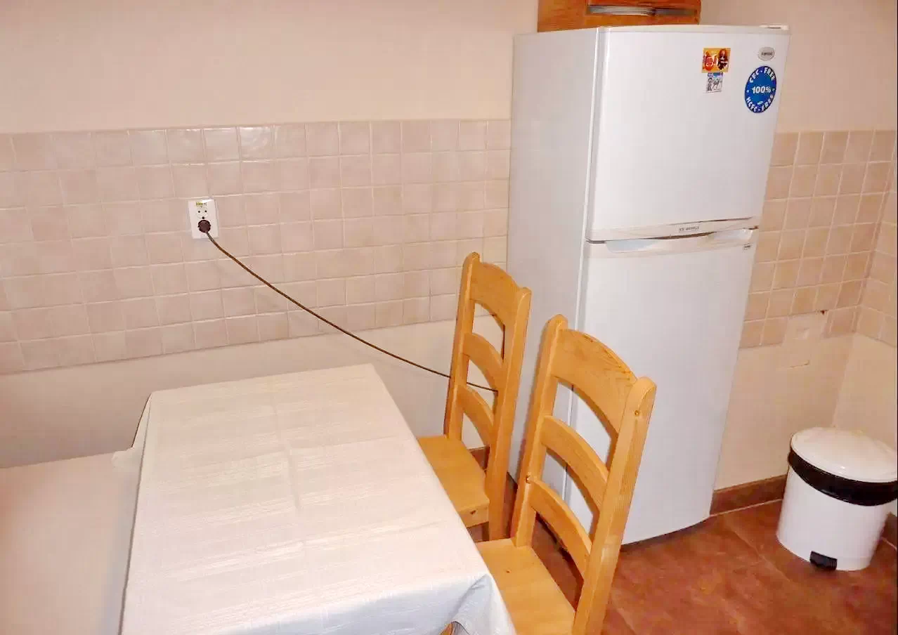 Nappali-ebédlő (kihúzható fotelágy 2 főre), konyha, két fürdőszoba (zuhanyzó, WC, kézmosó).