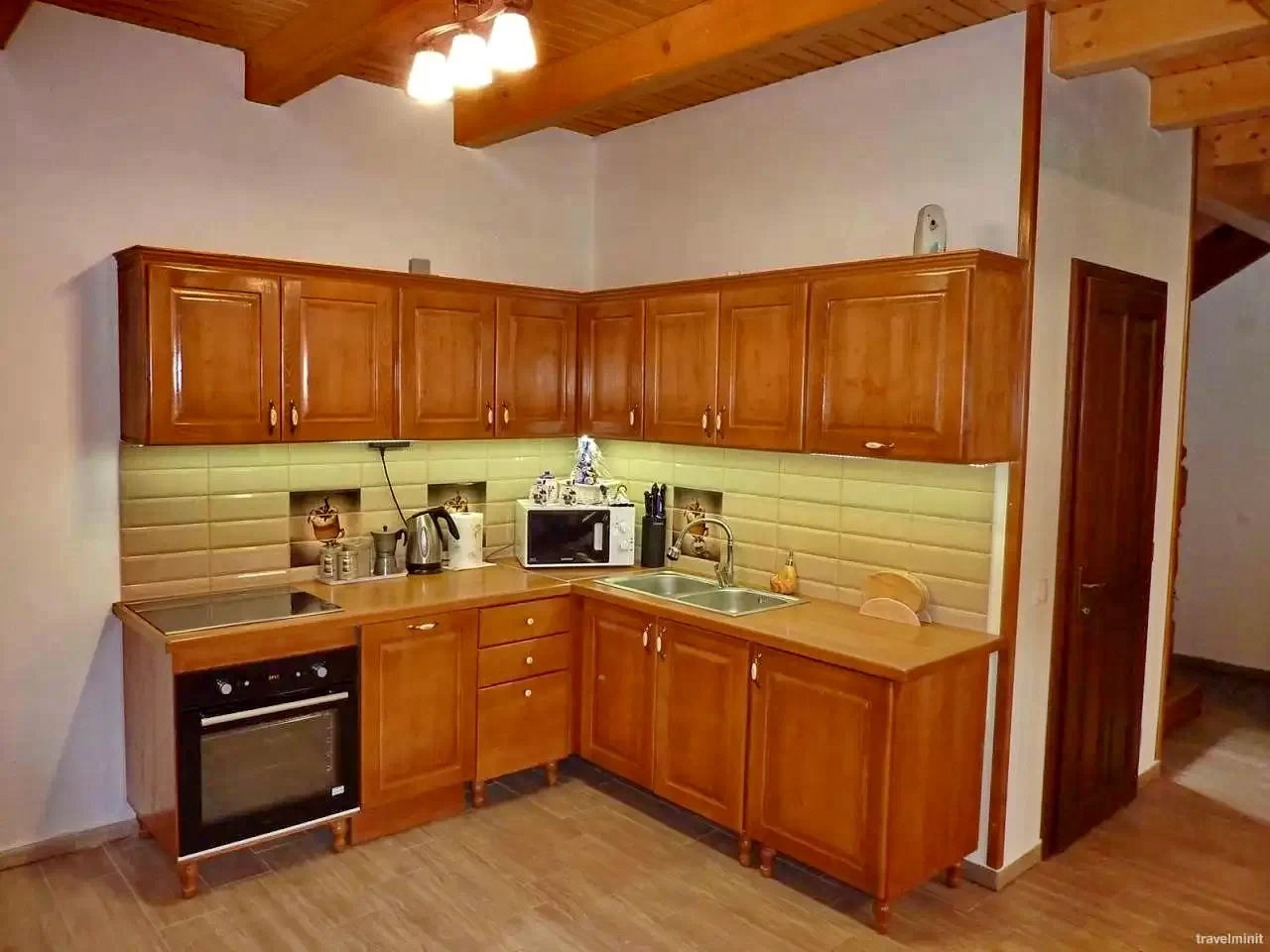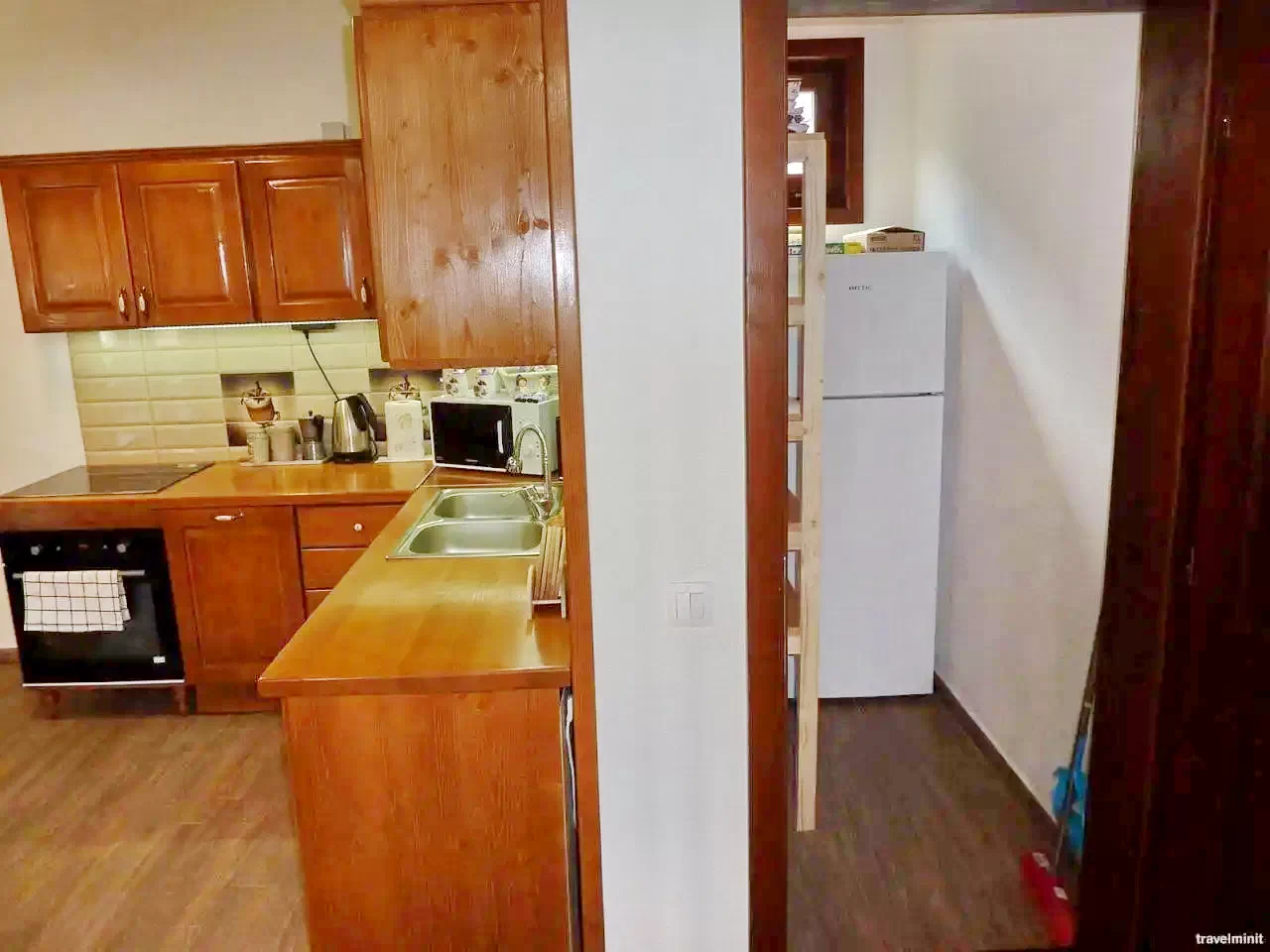 - A földszinten található egy nappali-ebédlő egy kétszemélyes és egy egyszemélyes kihúzható fotelággyal (3 fő), egy felszerelt konyha és egy fürdőszoba (zuhanyzóval, WC-vel, kézmosóval).