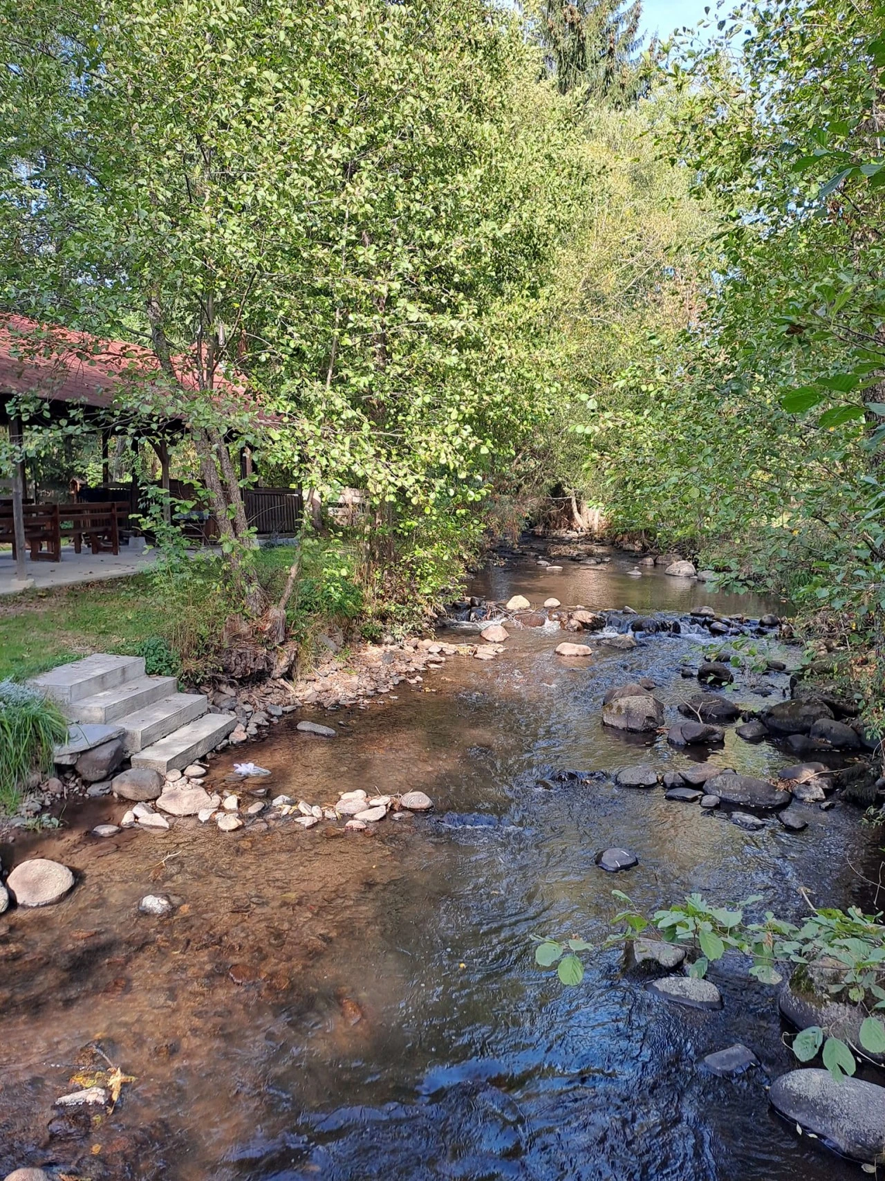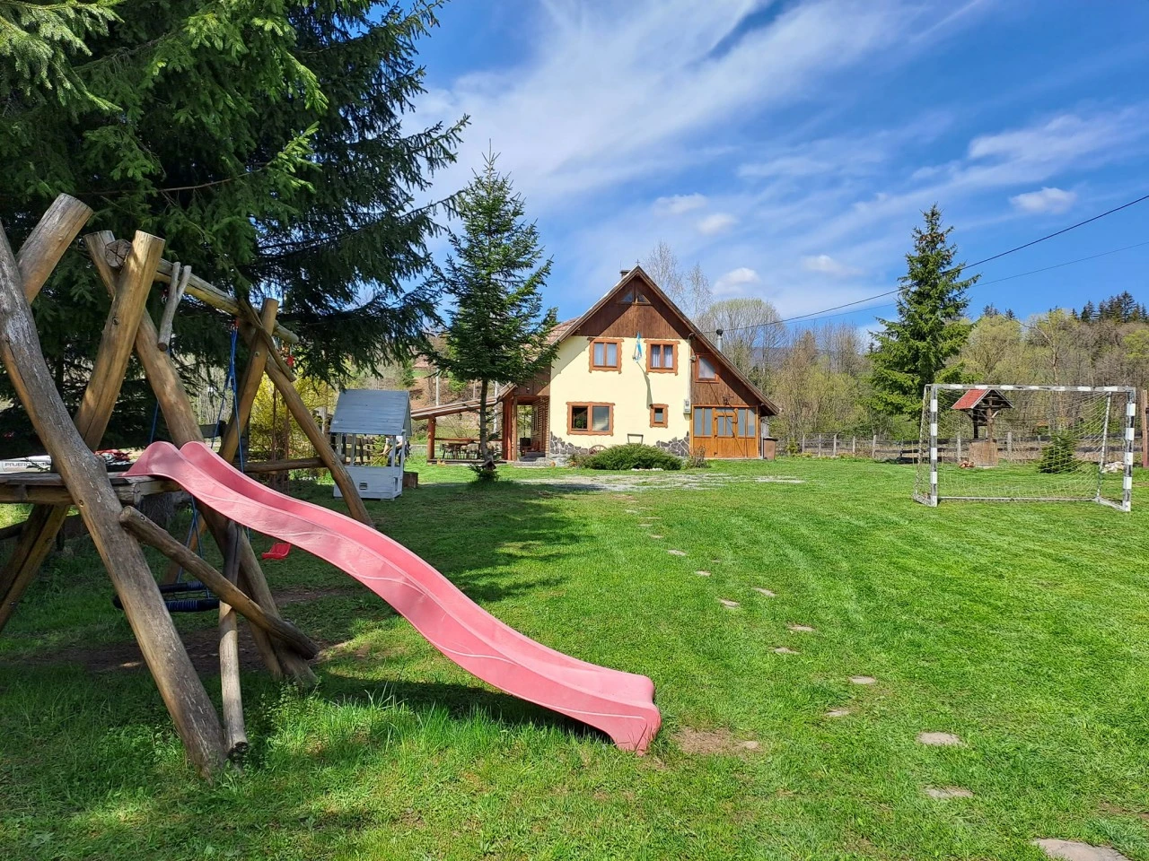 Pihenés: Parkosított kert, terasz, fedett pavilon, játszótér (hinta, csúszda).
