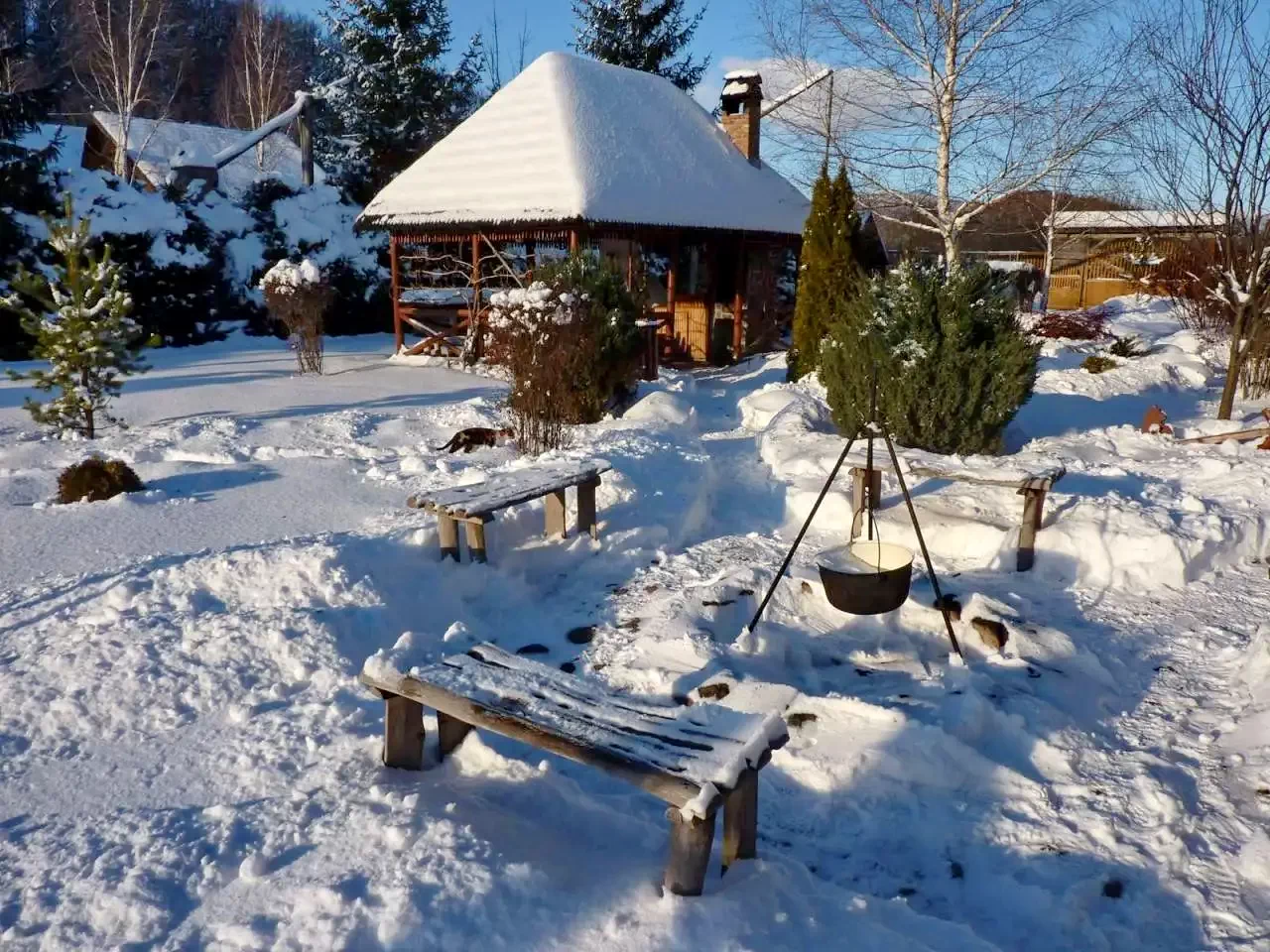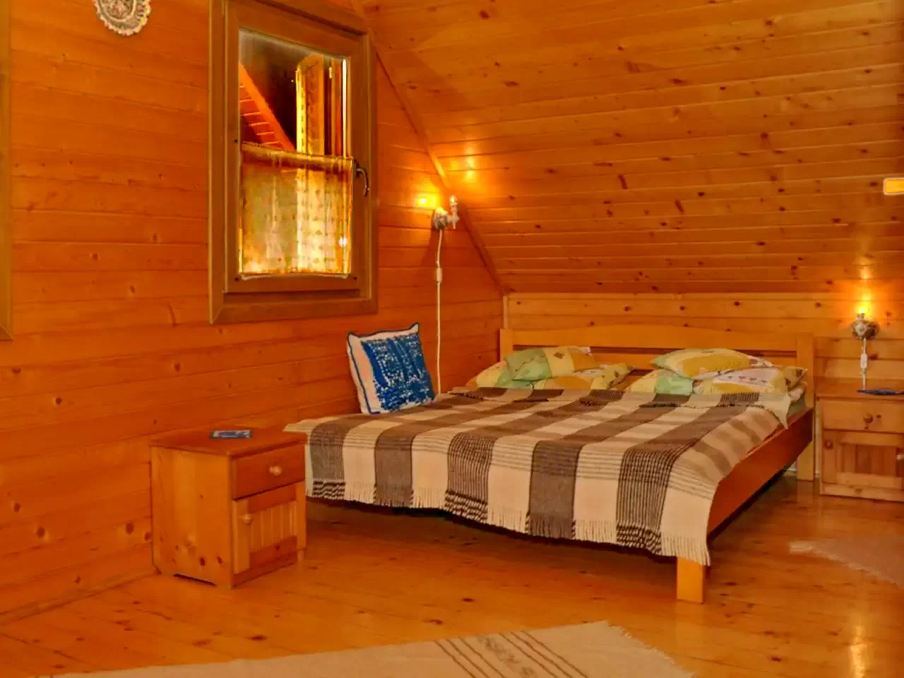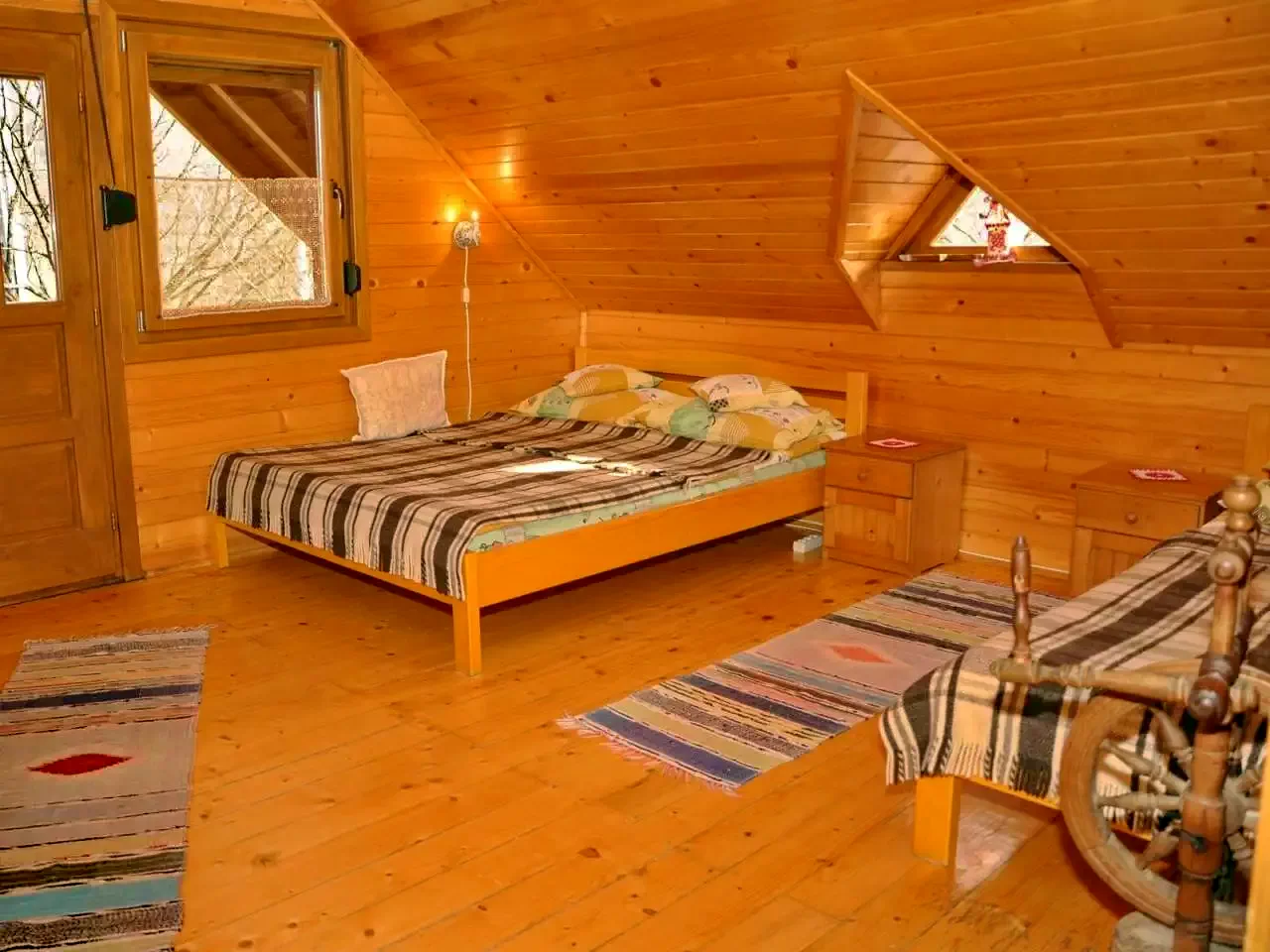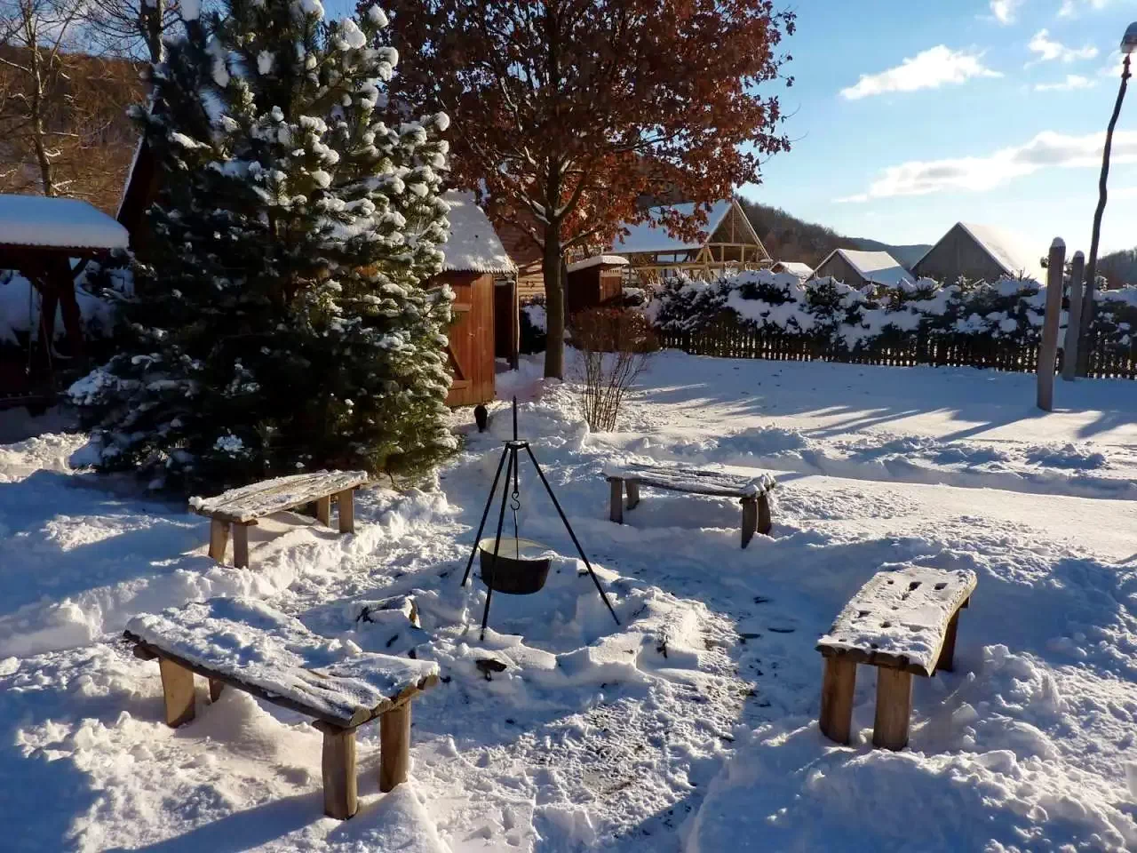 - Kisházak (2 x 2 férőhely): Két különálló, téliesített kisház, egyenként kétszemélyes ággyal, saját fürdőszobával (WC, zuhanyzó, kézmosó, villanybojler) és termosztáttal szabályozható fűtéssel.