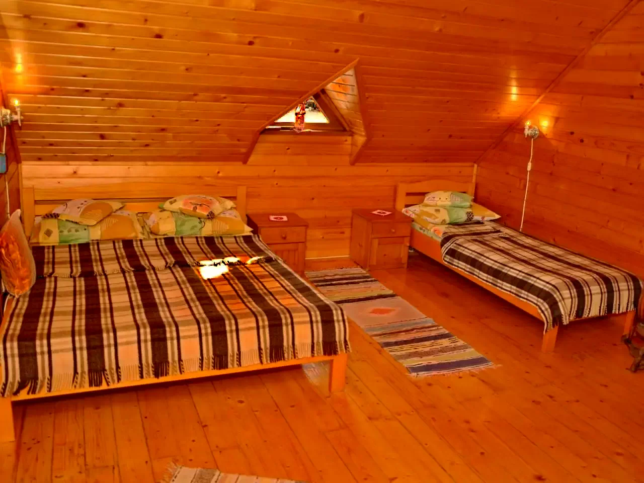 - Emelet: 1 db 3 fős szoba (1 egyszemélyes és 1 kétszemélyes ágy, pótágy), 1 db 2 fős szoba (kétszemélyes ágy, pótágy), különálló mellékhelyiség a folyosón.